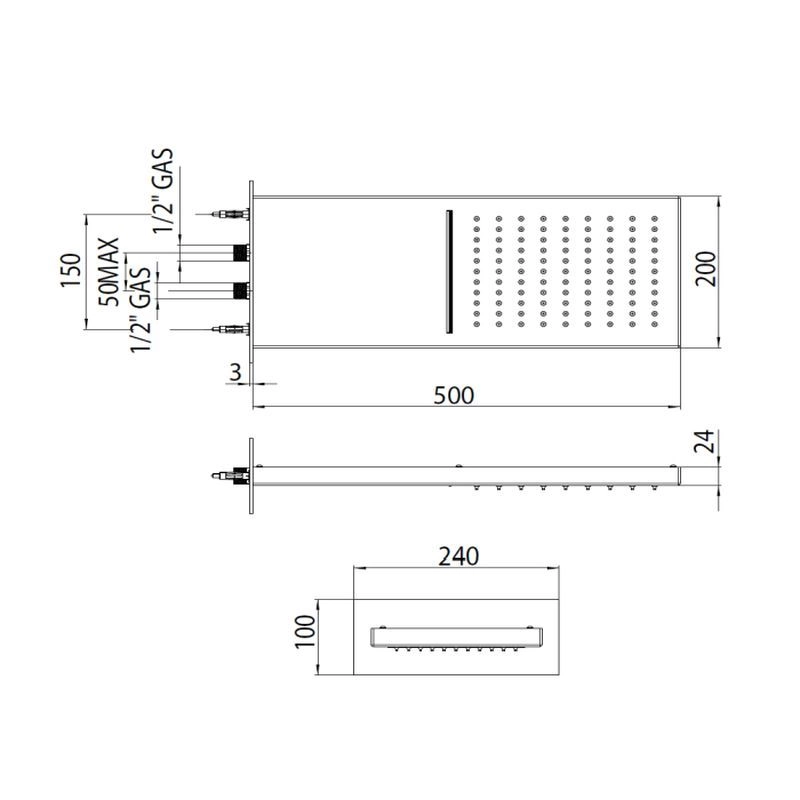Прямоугольный верхний душ 500x200 с различными режимами струи и предлагает 2 функции : дополнительно к традиционной широкой струе дождя теперь можно выбрать мощный каскад, дождевую струю водопада.. Душ оснащен резиновыми диффузорами система Easy-Clean - Легкая очистка от извесковых отложений скопивишехся от воды. Насыщенная воздухом душевая струя обильно обливает ваше тело водой. Наслаждайтесь водными процедкрами каждый раз принимая душ. Для включения необходимо установить смеситель внутреннего монтажа.