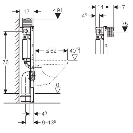 Рама с C-образным профилем 4/4 см. Высота элемента 82 см. Двойной смыв со смывной клавишей Omega20, Omega30 или Omega60. Опорная площадка поворотная, для монтажа в U-образный профиль UW 50 и UW 75. Рама подготовлена для крепления крепежных скоб для установки санфаянса с малой контактной поверхностью. Оцинкованные стойки, регулируемые в диапазоне 0 - 20 см. Стойки с защитой от скольжения. Соединительное колено монтируется на различной глубине без использования инструментов, диапазон смещения - 45 мм. Шумопоглощающее крепление для фанового отвода. Смывной бачок скрытого монтажа со смывной клавишей верхней / фронтальной установки, с противоконденсатной оболочкой. При заводской установке возможен немедленный последующий смыв. Монтаж и сервисные работы на смывном бачке скрытого монтажа не требуют использования инструментов. Подвод воды сбоку с левой стороны или сзади с левой стороны. Оснащен трубкой подвода воды для подсоединения устройств Geberit AquaClean. Объем воды для смыва, заводская установка 6 и 3 л . Большой объем воды для смыва, диапазон настройки 4,5 / 6 / 7,5 л . Малый объем воды для смыва, диапазон настройки 3-4 л. Подключение к системе водоснабжения R 1/2 со встроенным угловым запорным вентилем и ручным маховичком. Коробка монтажная для окна обслуживания. Две защитные заглушки. Комплект соединительных патрубков для унитаза, ш 90 мм. Фановый отвод из ПНД, ш 90 мм. Переходный патрубок, ш 90/110 мм. 2 резьбовые шпильки M12. Крепежные элементы. Не включено: смывная клавиша