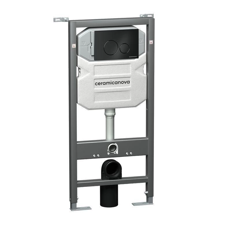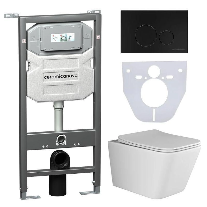 Сет 4 в 1: Подвесной унитаз Metric Rimless арт. CN3007 + Шумоизоляционная панель для инсталляции арт. CN1000 + Система инсталляции для унитазов CERAMICANOVA Envision с кнопкой смыва Round цвет чёрный матовый и креплениями, арт. CN1001B
