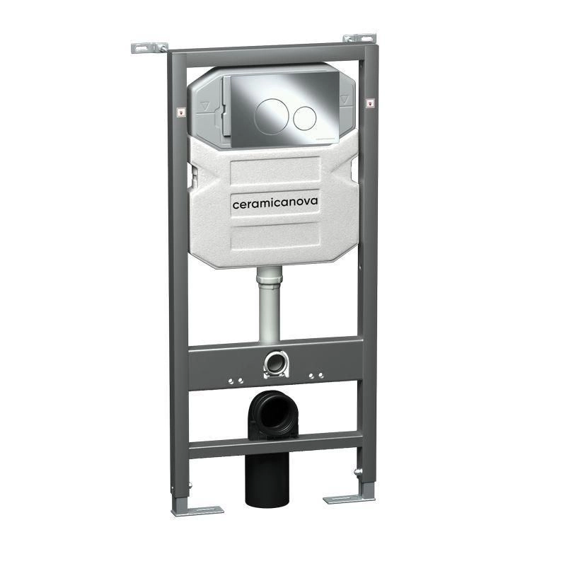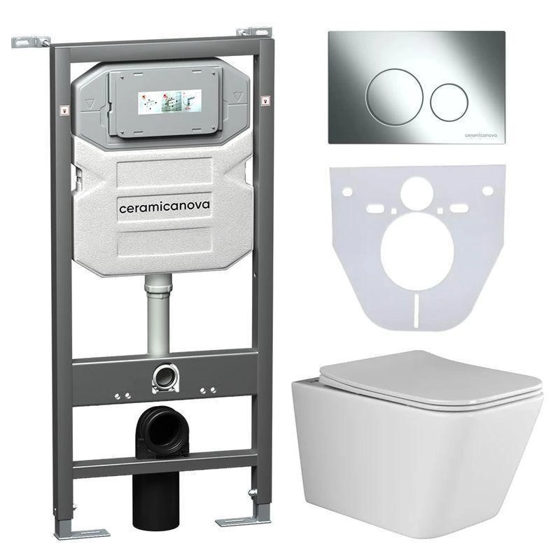 Сет 4 в 1: Подвесной унитаз Metric Rimless арт. CN3007 + Шумоизоляционная панель для инсталляции арт. CN1000 + Система инсталляции для унитазов CERAMICANOVA Envision с кнопкой смыва Round цвет хром и креплениями, арт. CN1001CH