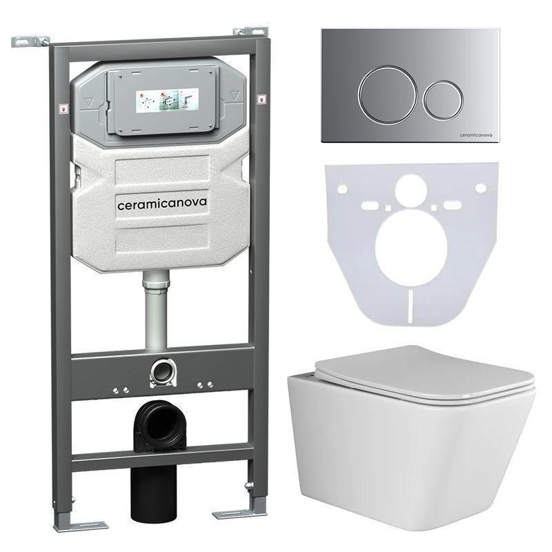 Сет 4 в 1: Подвесной унитаз Metric Rimless арт. CN3007 + Шумоизоляционная панель для инсталляции арт. CN1000 + Система инсталляции для унитазов CERAMICANOVA Envision с кнопкой смыва Round цвет хром матовый и креплениями, арт. CN1001M