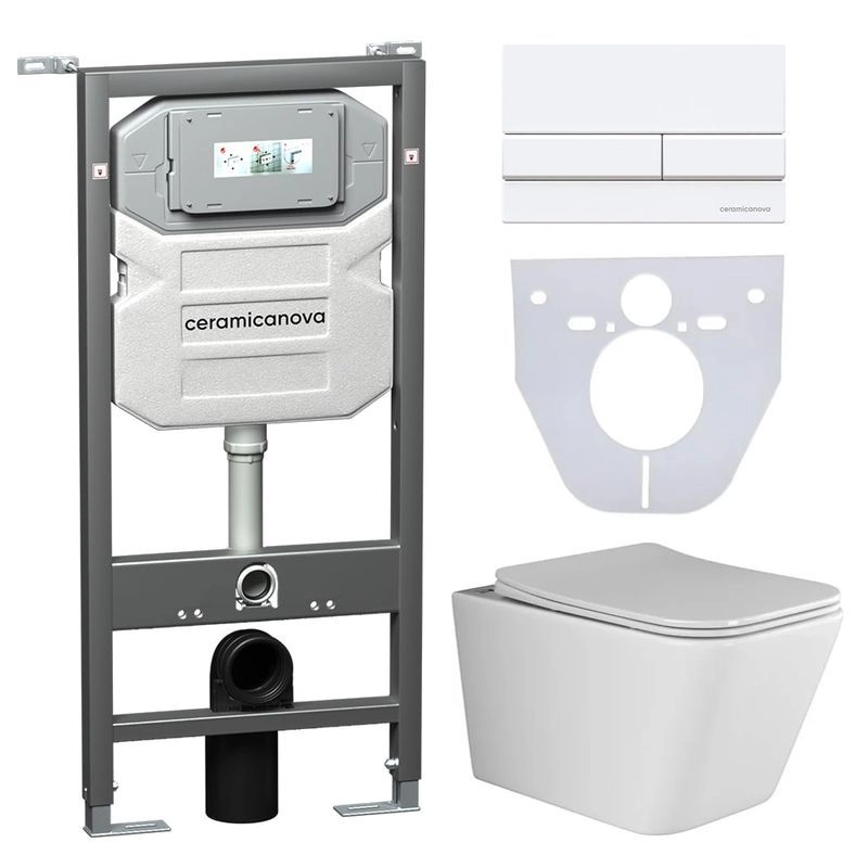 Сет 4 в 1: Подвесной унитаз Metric Rimless арт. CN3007 + Шумоизоляционная панель для инсталляции арт. CN1000 + Система инсталляции для унитазов CERAMICANOVA Envision с кнопкой смыва Flat цвет белый, креплениями, арт. CN1002W
