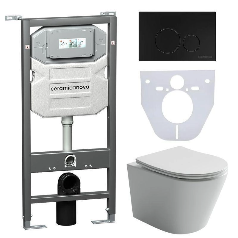 Сет 4 в 1: Подвесной унитаз Balearica Rimless арт. CN6000 + Шумоизоляционная панель для инсталляции арт. CN1000 + Система инсталляции для унитазов CERAMICANOVA Envision с кнопкой смыва Round цвет чёрный матовый и креплениями, арт. CN1001B