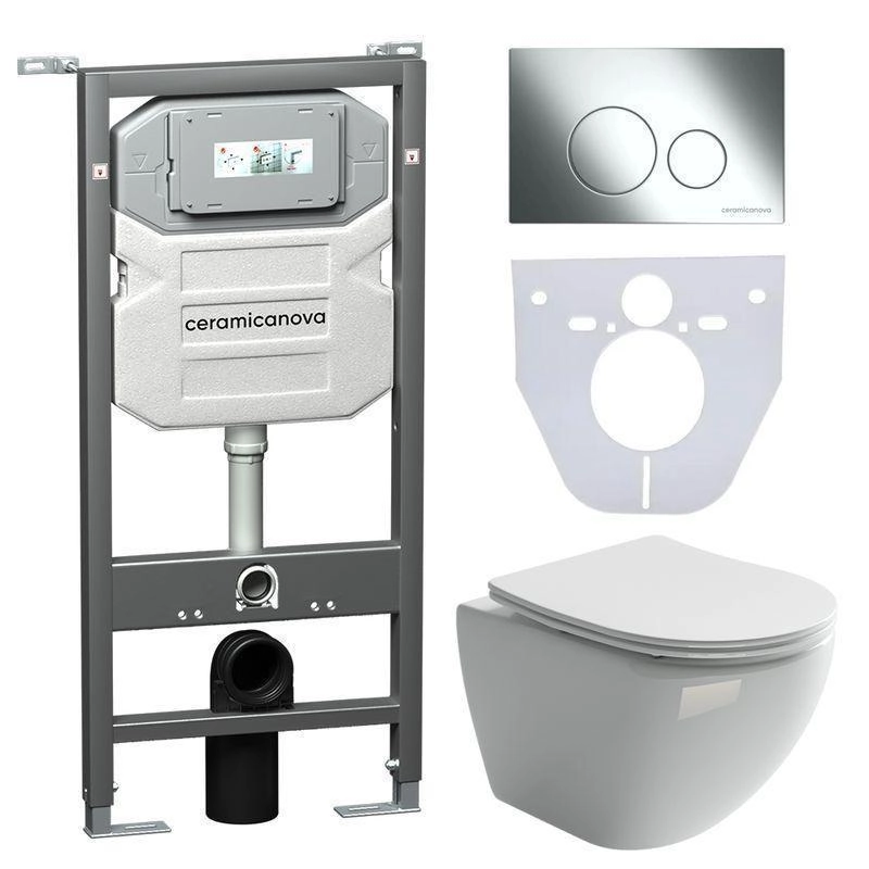 Сет 4 в 1: Подвесной унитаз Metropol Rimless арт. CN4002 + Шумоизоляционная панель для инсталляции арт. CN1000 + Система инсталляции для унитазов CERAMICANOVA Envision с кнопкой смыва Round цвет хром и креплениями, арт. CN1001CH