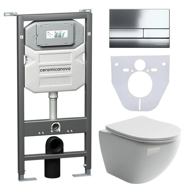 Сет 4 в 1: Подвесной унитаз Metropol Rimless арт. CN4002 + Шумоизоляционная панель для инсталляции арт. CN1000 + Система инсталляции для унитазов CERAMICANOVA Envision с кнопкой смыва Flat цвет хром, креплениями, арт. CN1002CH