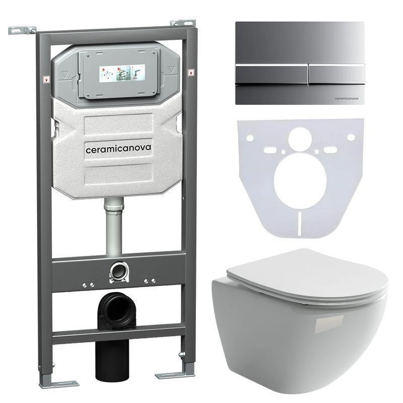Сет 4 в 1: Подвесной унитаз Metropol Rimless арт. CN4002 + Шумоизоляционная панель для инсталляции арт. CN1000 + Система инсталляции для унитазов CERAMICANOVA Envision с кнопкой смыва Flat цвет хром матовый, креплениями, арт. CN1002M