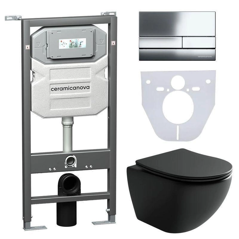 Сет 4 в 1: Подвесной унитаз Metropol Rimless арт. CN4002MB + Шумоизоляционная панель для инсталляции арт. CN1000 + Система инсталляции для унитазов CERAMICANOVA Envision с кнопкой смыва Flat цвет хром, креплениями, арт. CN1002CH