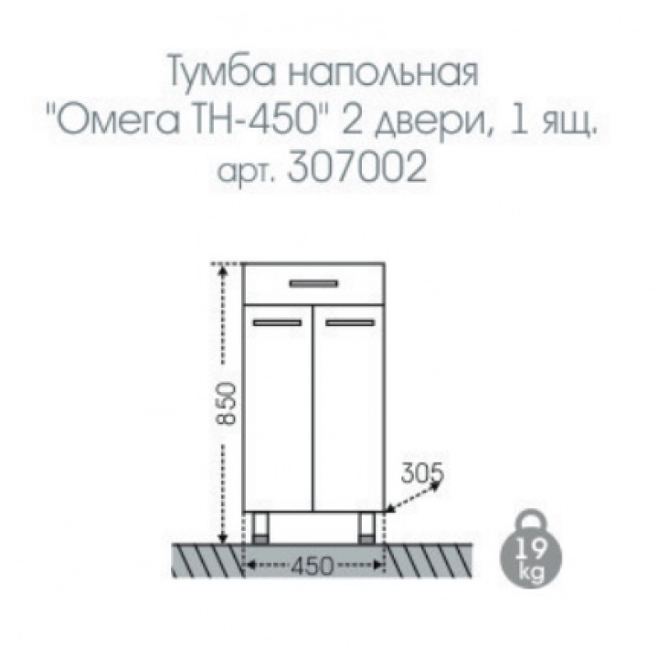 Тумба СаНта Омега 45 307002, напольная (2 двери, 1 ящик) Комплектация: Ручка хром - 3, выдвижной ящик - 1, На дверках петли плавного закрывания, ножка хром - 2, ножка пластик - 2