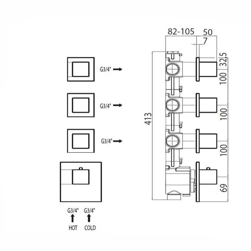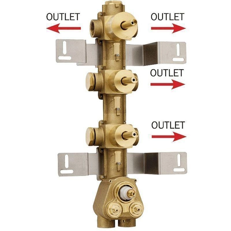 Bossini Z030271000 Встраиваемая часть термостата для душа и ванны на 4 выхода. Встраиваемая термостатическая часть смесителя высокой пропускной способности на 4 выхода с переключателем на 2 выхода и двумя вентилями открыто-закрыто. Подключение 3/4” F. Установка горизонтальная или вертикальная.