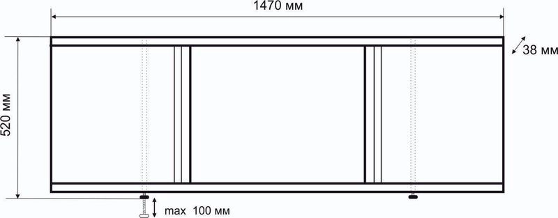 мм : 520х1470х38.Каркас экрана выполнен из алюминиевого профиля, дверки изготовлены из МДФ и покрыты ПВХ пленкой толщиной 0,45 мм. Экран имеет 3 раздвижных створки с фрезированными ручками. Алюминиевый профиль окрашен порошковой краской белого цвета. Высота экрана 500 мм+ножки 20 мм. Ножки регулируются на 100 мм. Вертикальные стойки смещены к центру, что позволяет при необходимости его подрезать.