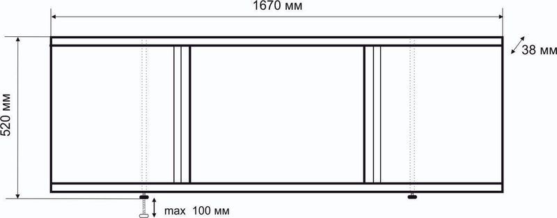 мм : 520х1670х38.Каркас экрана выполнен из алюминиевого профиля, дверки изготовлены из МДФ и покрыты ПВХ пленкой толщиной 0,45 мм. Экран имеет 3 раздвижных створки с фрезированными ручками. Алюминиевый профиль окрашен порошковой краской белого цвета. Высота экрана 500 мм+ножки 20 мм. Ножки регулируются на 100 мм. Вертикальные стойки смещены к центру, что позволяет при необходимости его подрезать.