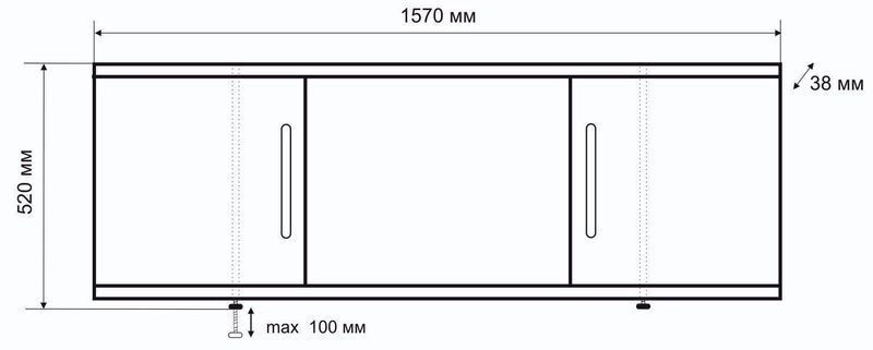 мм : 520х1570х39.Каркас экрана выполнен из алюминиевого профиля, дверки изготовлены из МДФ и покрыты ПВХ пленкой толщиной 0,45 мм. Экран имеет 3 раздвижных створки с фрезированными ручками. Алюминиевый профиль окрашен порошковой краской белого цвета. Высота экрана 500 мм+ножки 20 мм. Ножки регулируются на 100 мм. Вертикальные стойки смещены к центру, что позволяет при необходимости его подрезать.