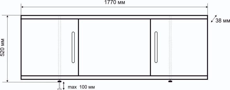 мм : 520х1770х38.Каркас экрана выполнен из алюминиевого профиля, дверки изготовлены из МДФ и покрыты ПВХ пленкой толщиной 0,45 мм. Экран имеет 3 раздвижных створки с фрезированными ручками. Алюминиевый профиль окрашен порошковой краской белого цвета. Высота экрана 500 мм+ножки 20 мм. Ножки регулируются на 100 мм. Вертикальные стойки смещены к центру, что позволяет при необходимости его подрезать.