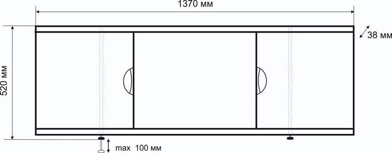 мм : 520х1370х38.Каркас экрана выполнен из алюминиевого профиля, дверки изготовлены из МДФ и покрыты ПВХ пленкой толщиной 0,45 мм. Экран имеет 3 раздвижных створки. Алюминиевый профиль окрашен порошковой краской белого цвета. Высота экрана 500 мм+ножки 20 мм. Ножки регулируются на 100 мм. Вертикальные стойки смещены к центру, что позволяет при необходимости его подрезать.