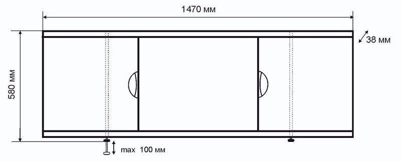 мм : 580х1470х38.Каркас экрана выполнен из алюминиевого профиля, дверки изготовлены из МДФ и покрыты ПВХ пленкой толщиной 0,45 мм. Экран имеет 3 раздвижных створки. Алюминиевый профиль окрашен порошковой краской белого цвета. Высота экрана 500 мм+ножки 20 мм. Ножки регулируются на 100 мм. Вертикальные стойки смещены к центру, что позволяет при необходимости его подрезать.