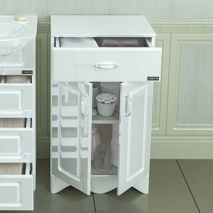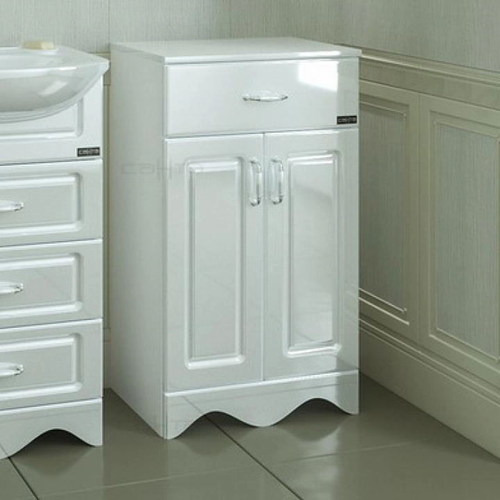 Тумба СаНта Верона 500 710012 напольная (1 ящ. ) Основные характеристики: - Размер: Ш50*В85*Г33 см - Установка: напольная - 2 дверцы и 1 выдвижной ящик с плавным закрыванием - Материал фасада: МДФ - Материал корпуса: ЛДСП - Покрытие: пленка ПВХ - Цвет: белый Комплектуется: Зеркальный шкаф СаНта Стандарт 80 113010/113011, без подсветки/с подсветкой: - Зеркало-шкаф, трельяж - С полками - С фацетом - С подсветкой/без подсветки - Размер (без подсветки): 79.3*15.5*73.5 см - Размер (с подсветкой): 79.3*15.5*77.5 см - Комплектация (зеркальный шкаф с подсветкой): розетка и выключатель - Цвет: белый Пенал СаНта Верона-30 710006, напольный - 2 распашных фасада, 2 выдвижных ящика - Петли справа - Размер: 30*191*28,5 см - Цвет: белый