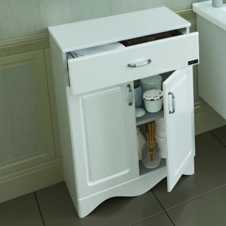 Тумба СаНта Верона 600 710013 напольная (1 ящ. ) Основные характеристики: - Размер: Ш60*В85*Г33 см - Установка: напольная - 2 дверцы и 1 выдвижной ящик с плавным закрыванием - Материал фасада: МДФ - Материал корпуса: ЛДСП - Покрытие: пленка ПВХ - Цвет: белый Комплектуется: Зеркальный шкаф СаНта Стандарт 80 113010/113011, без подсветки/с подсветкой: - Зеркало-шкаф, трельяж - С полками - С фацетом - С подсветкой/без подсветки - Размер (без подсветки): 79.3*15.5*73.5 см - Размер (с подсветкой): 79.3*15.5*77.5 см - Комплектация (зеркальный шкаф с подсветкой): розетка и выключатель - Цвет: белый Пенал СаНта Верона-30 710006, напольный - 2 распашных фасада, 2 выдвижных ящика - Петли справа - Размер: 30*191*28,5 см - Цвет: белый
