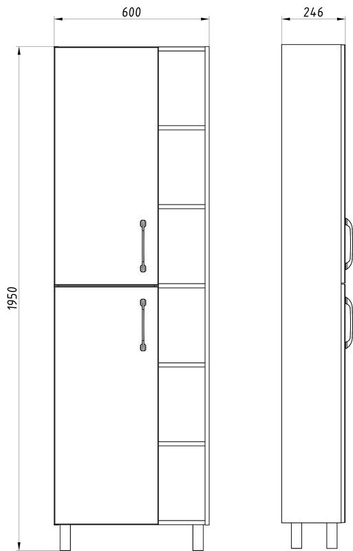 крепеж к стене, 2 дверки, 3 полочки ЛДСП внутри пенала, 5 полочек ЛДСП открытые