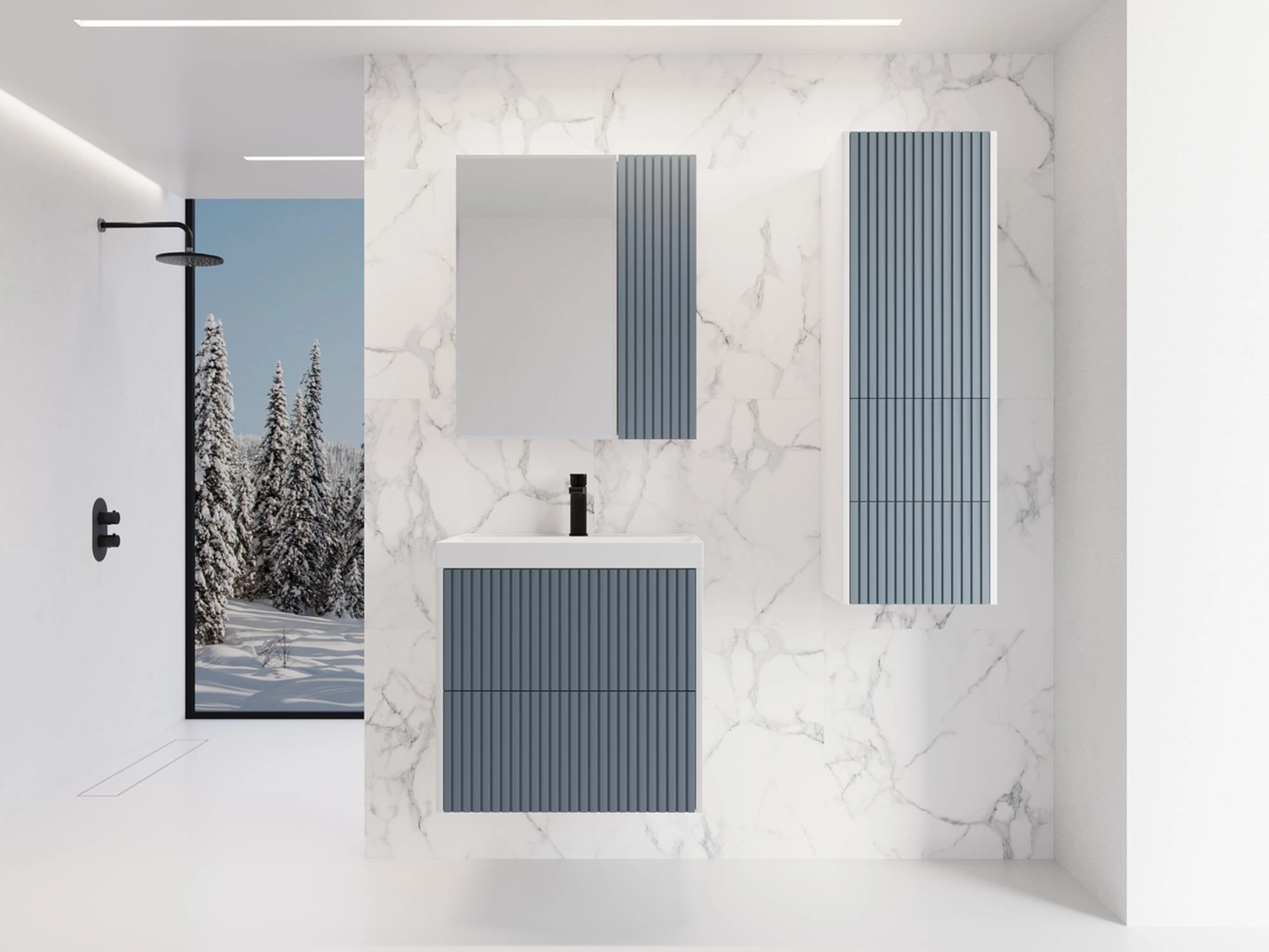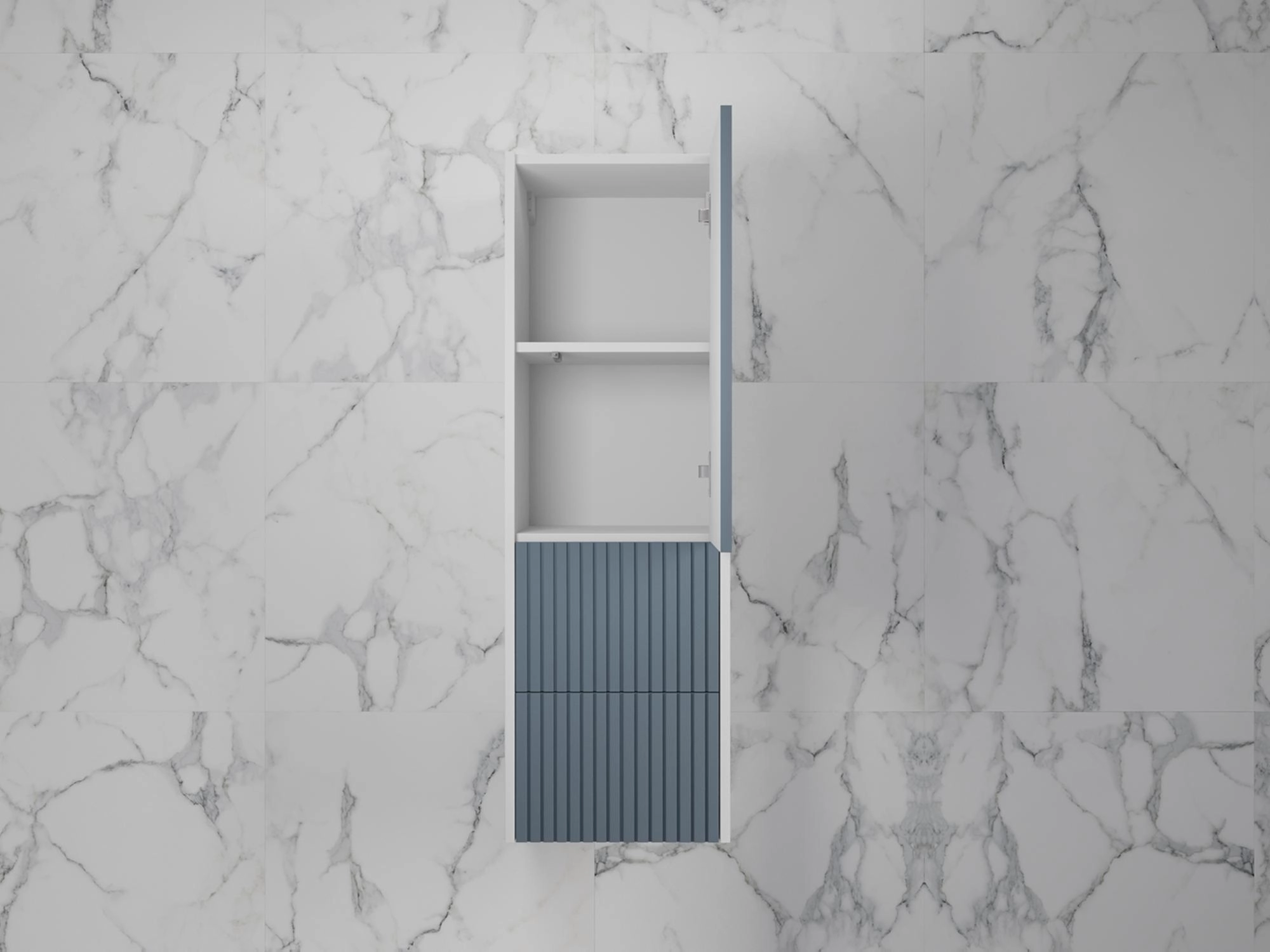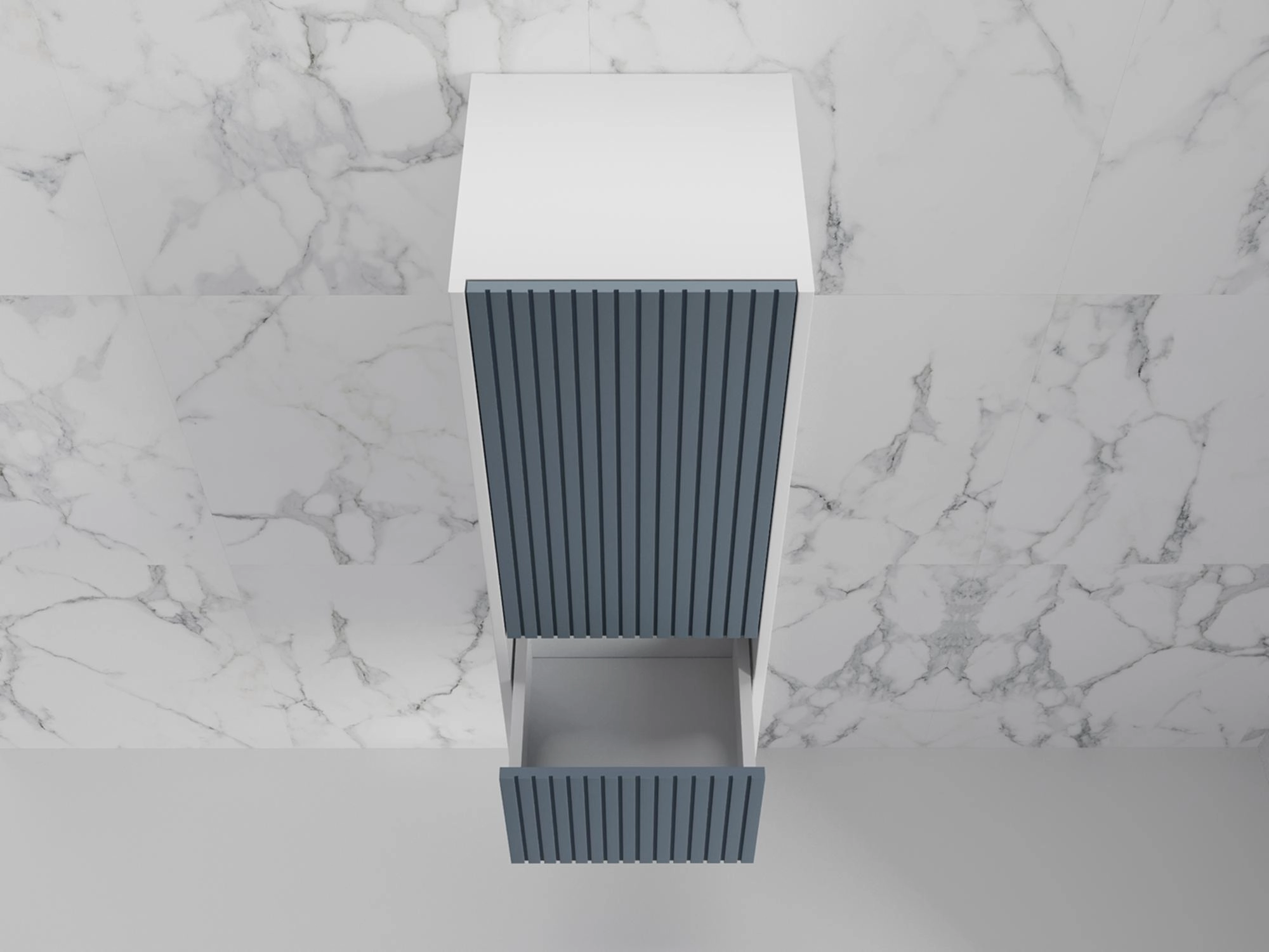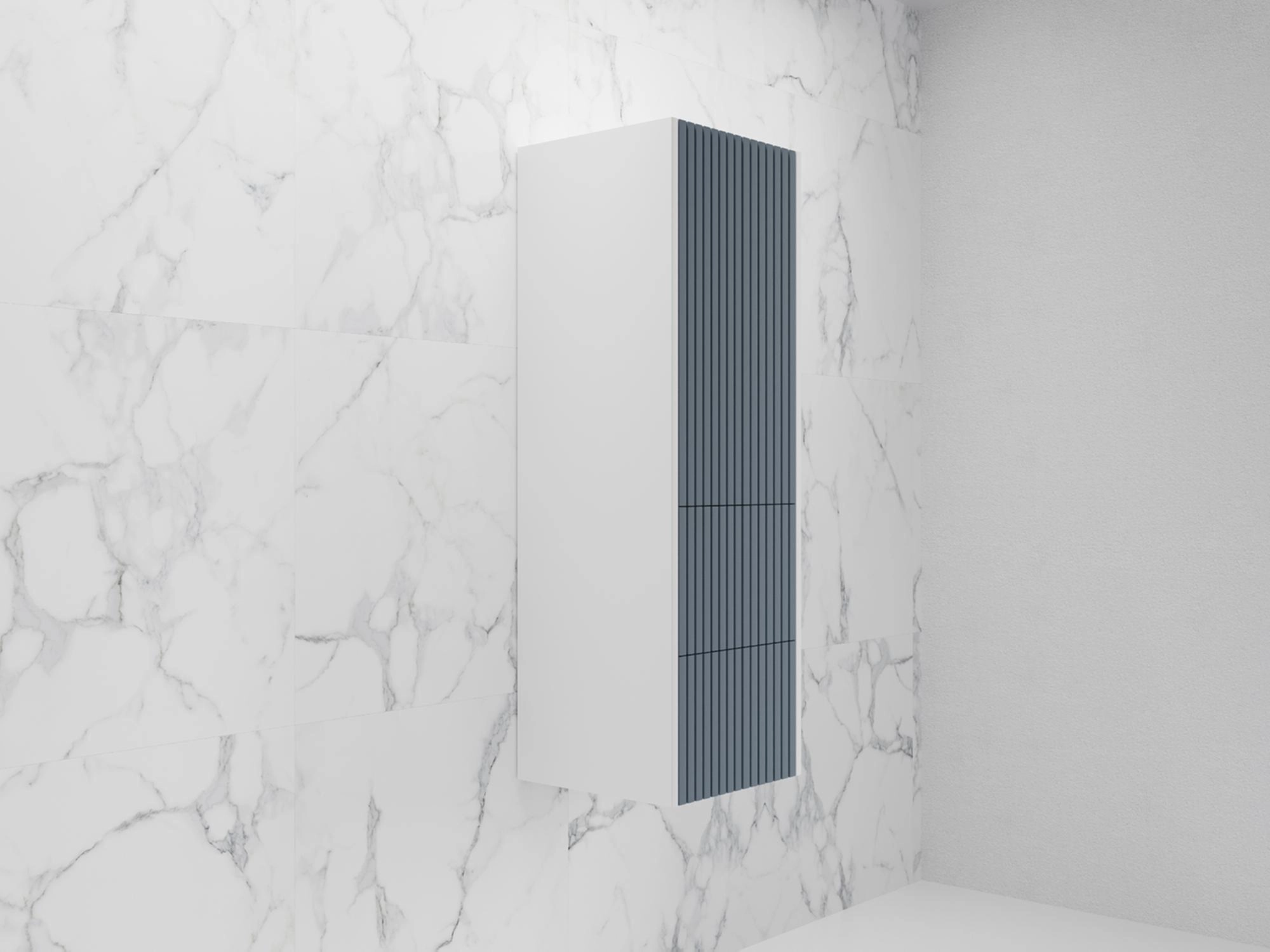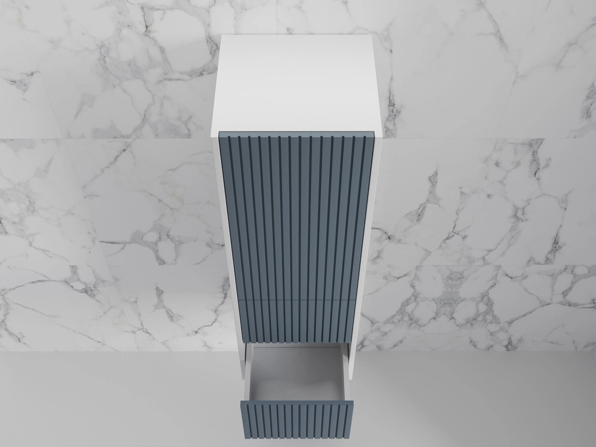 Корпус и фасады из МДФ в матовой пленке СОФТ ТАЧ, цвет белый софт и графит софт, фрезеровка рейками. Система открывания нажатием на фасад PUSH TO OPEN. Все выдвижные ящики оснащены направляющими скрытого монтажа HETTICH.