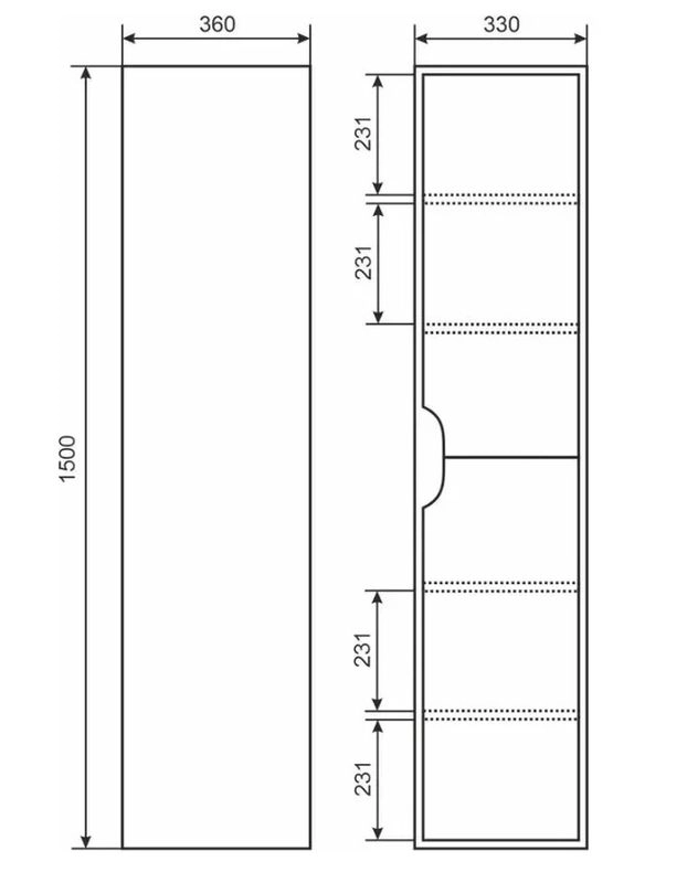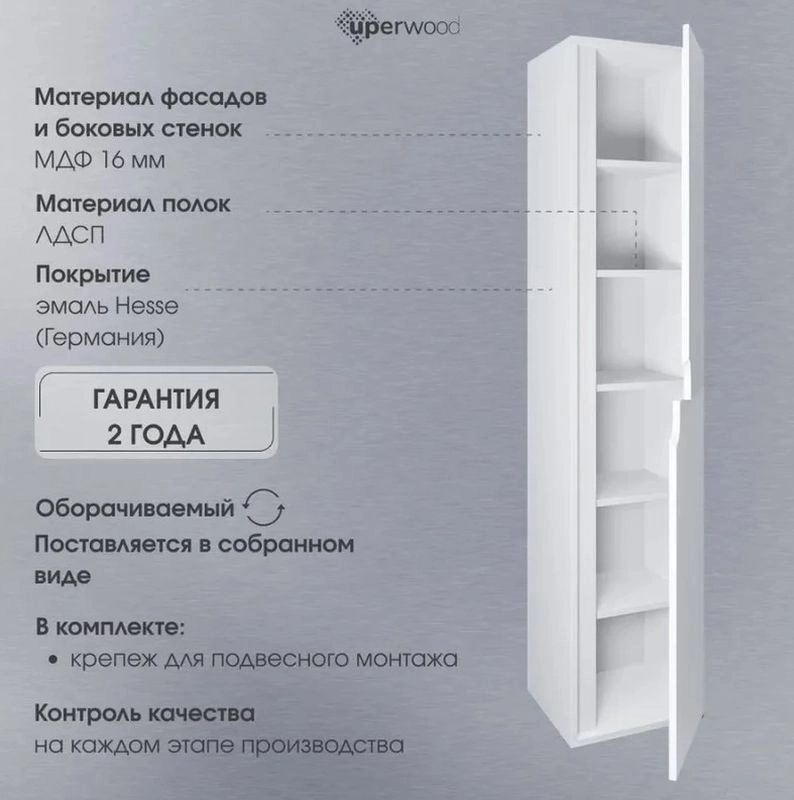 Подвесной шкаф-пенал Uperwood Modul для ванной комнаты представляет собой функциональное, надежное и практичное решение, которое отлично впишется в любой современный дизайн ванной комнаты. Шкаф-пенал Uperwood Modul представлен как в закрытом варианте исполнения и имеет 2 распашные дверцы, за которыми находятся полки, так и в открытом, с одним выдвижным ящиком, распашной дверцей и полками.