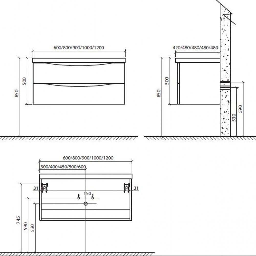 База под раковину подвесная с двумя выкатными ящиками, с доводчиками 600x420x450 C врезной (фрезерованной) ручкой в плоскости фасада