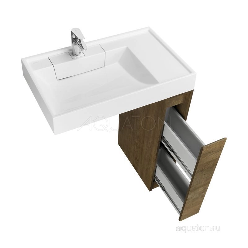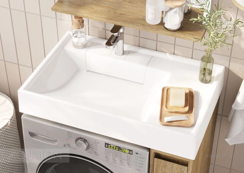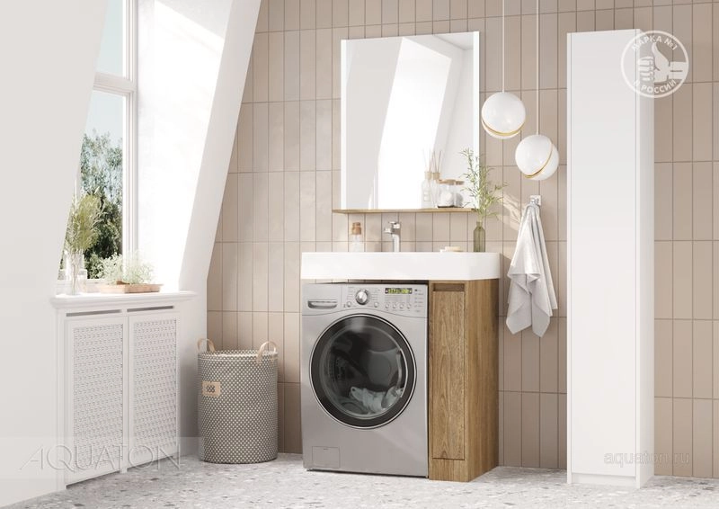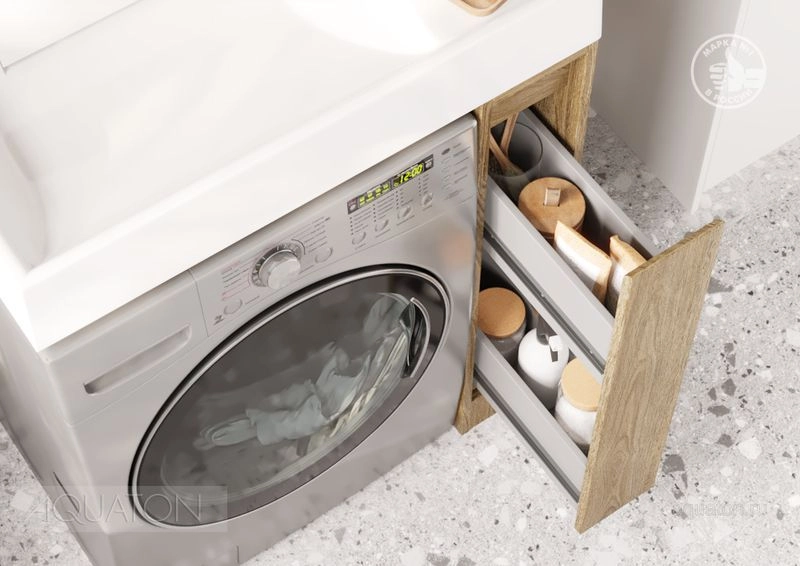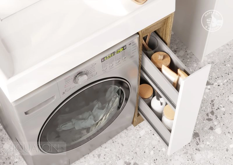 Тумба Лондри под стиральную машину выполнена из влагостойкой ламинированной плиты в древесной отделке. Корпус тумбы и фасад приобретаются отдельно. Тумбы комплектуются фасадами как с такой же древесной текстурой, так и в универсальном белом глянцевом цвете – это позволяет выбрать модель тумбы в соответствии с личными предпочтениями, создав наиболее удачное решение для конкретного интерьера ванной комнаты. Более того, при желании в одной тумбе можно совместить корпус и фасады в двух разных по оттенку древесных декорах. За фасадом тумбы скрывается удобная бутылочница. Открытие тумбы Лондри осуществляется за фасад благодаря эргономичному выпилу под углом. Ящик состоит из двух отделений: верхнего и нижнего. Каждое отделение ящика выдерживает нагрузку до 20 кг. Тумба комплектуется раковиной Рейн 80 из прочного литого мрамора. Компактный размер данного комплекта подойдет для небольших ванных комнат и обеспечит место для хранения необходимых предметов и аксессуаров. Дополнительно к тумбе можно приобрести шкаф-колонну Лондри и зеркальный шкаф Лондри 80.