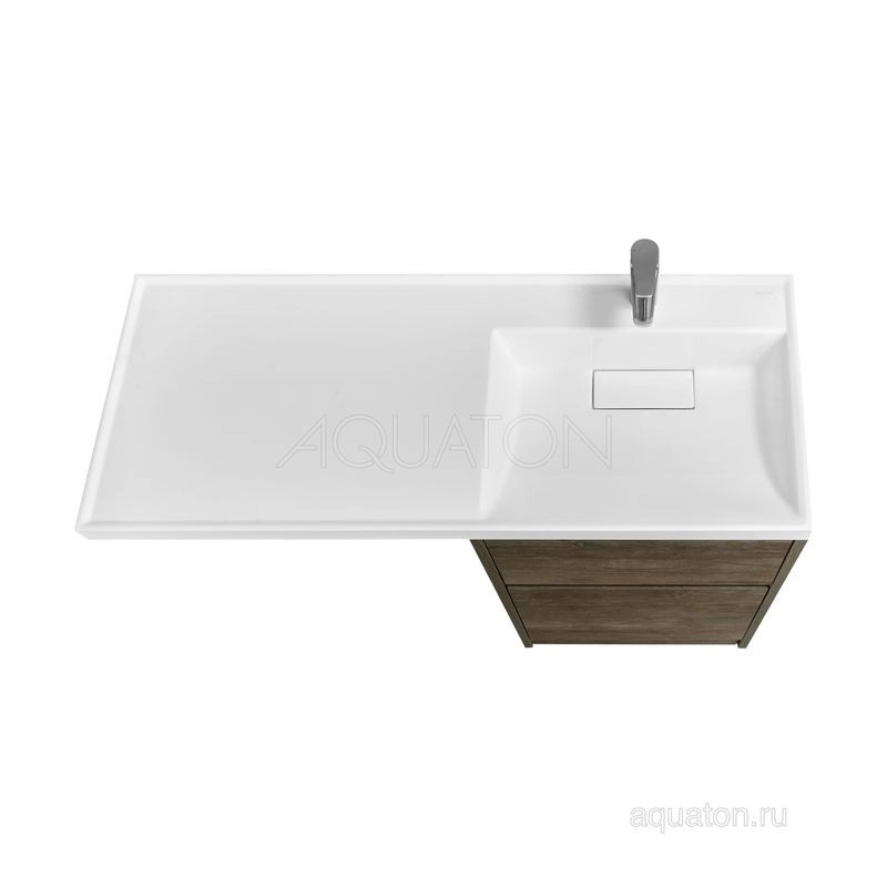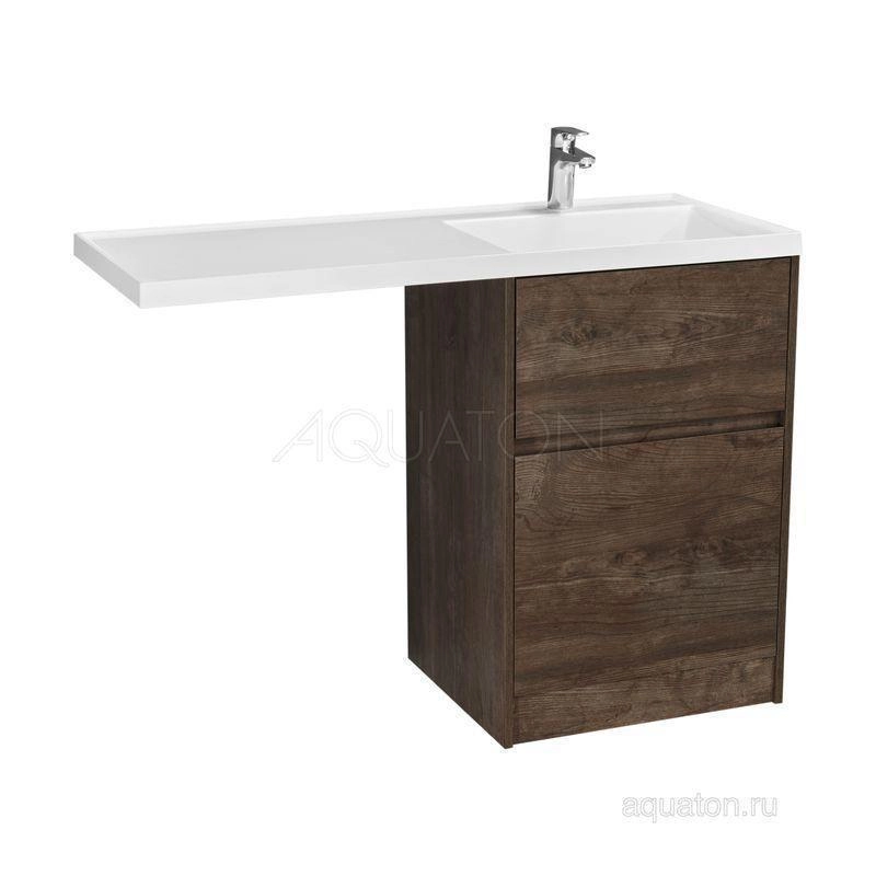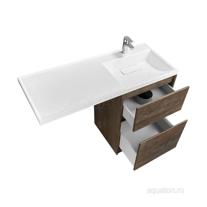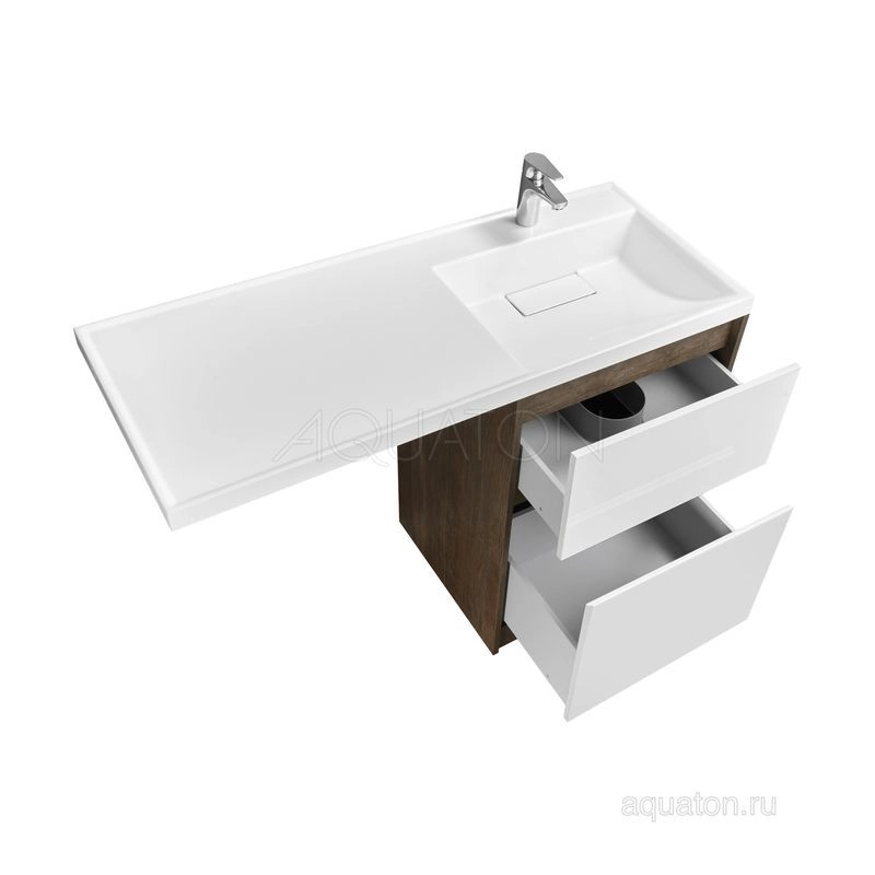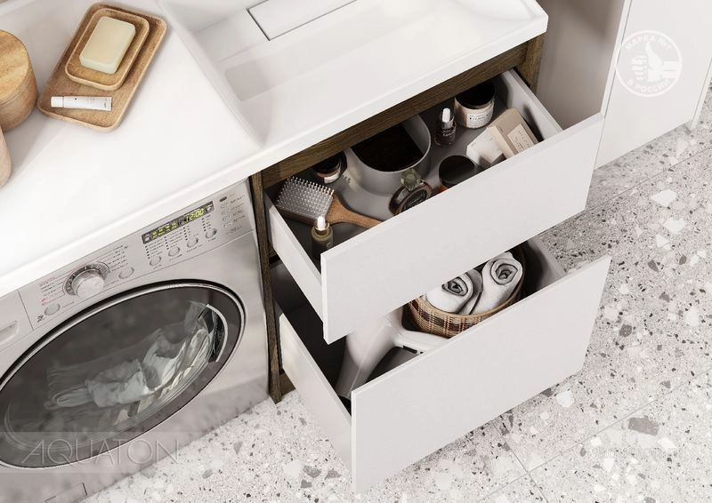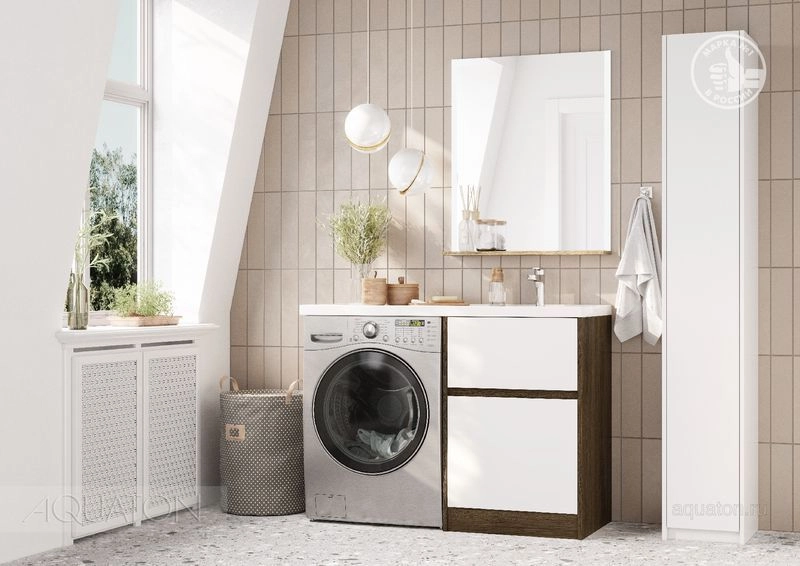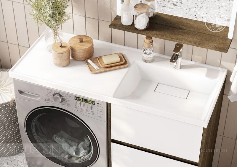 Тумба Лондри под стиральную машину выполнена из влагостойкой ламинированной плиты в древесной отделке. Корпус тумбы и фасад приобретаются отдельно. Тумбы комплектуются фасадами как с такой же древесной текстурой, так и в универсальном белом глянцевом цвете – это позволяет выбрать модель тумбы в соответствии с личными предпочтениями, создав наиболее удачное решение для конкретного интерьера ванной комнаты. Более того, при желании в одной тумбе можно совместить корпус и фасады в двух разных по оттенку древесных декорах. Верхний ящик открывается с помощью системы push-to-open, а нижний - за фасад с помощью удобного выпила под углом. Ящики выдерживают нагрузку до 25 кг. Тумба установлена на регулируемые опоры, которые находятся за цоколем. Тумба комплектуется раковиной Лондри 120 из прочного литого мрамора, который устойчив к воздействию химических средств. Широкое крыло раковины обеспечивает ванную комнату дополнительным функциональным пространством. Дополнительно к тумбе можно приобрести шкаф-колонну Лондри и зеркальный шкаф Лондри 120.