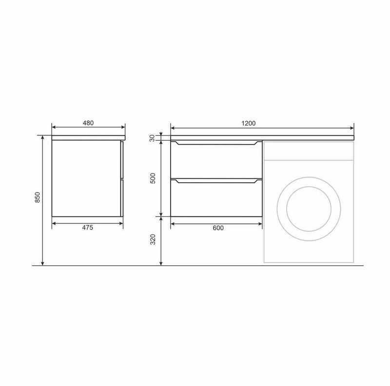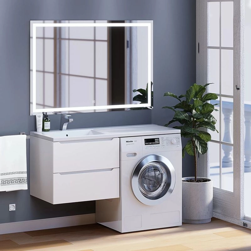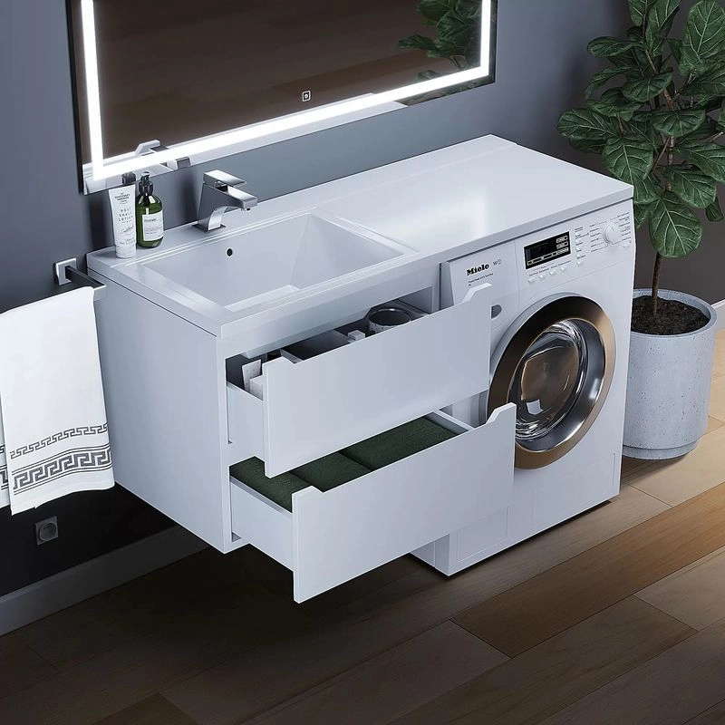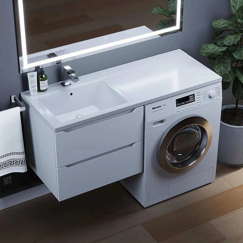 Описание : Комплект для установки со стиральной машиной, состоящий из подвесной тумбы Uperwood Tanos 60 см и раковины Cosmos 120 см. Тумба для установки со стиральной машиной Uperwood Tanos имеет 2 выдвижных ящика и представляет собой функциональное, надежное и практичное решение, которое отлично впишется в любой современный дизайн ванной комнаты. Элегантный минималистичный дизайн тумбы дополняет ее безупречная матовая поверхность. Фасад и боковые стенки изделия, выполненные из МДФ, покрыты эмалью Hesse (производство Германия). Толщина МДФ 16 мм. Выдвижные ящики изготовлены из влагостойкой ЛДСП. Ящики оснащены доводчиками. Качественная фурнитура премиум-класса. Размерный ряд тумб под стиральную машину Tanos представлен моделями 60 см белого цвета или белого с графитовыми вставками. В состав комплекта входит раковина Cosmos шириной 120 см. Под "крыло" раковины устанавливается стиральная машина. Тумба поставляется в собранном виде, в комплект входит крепеж для подвесного монтажа и кронштейн для раковины.