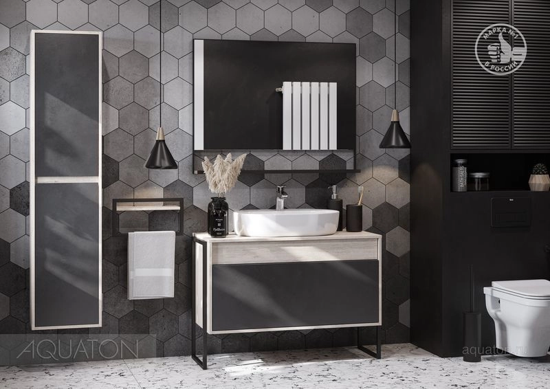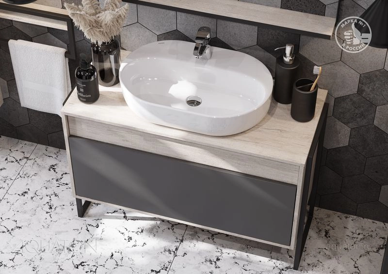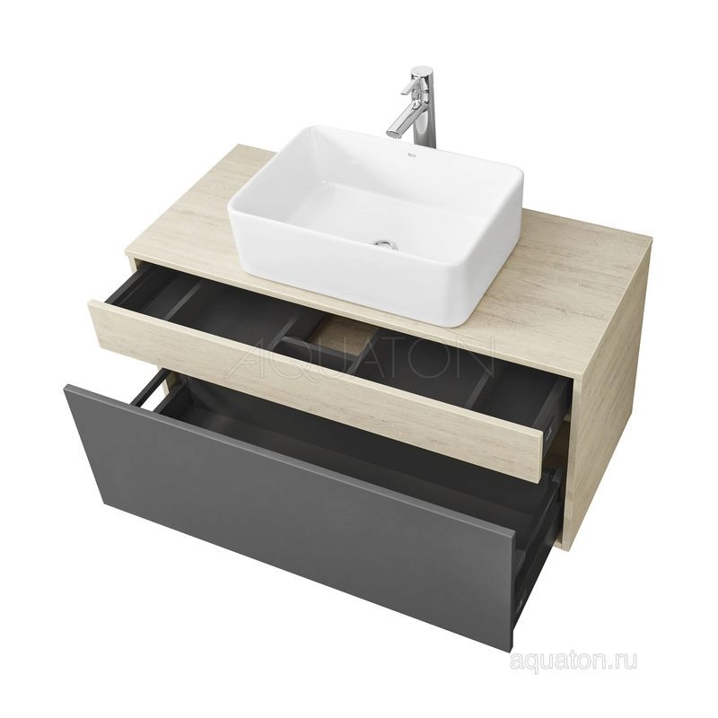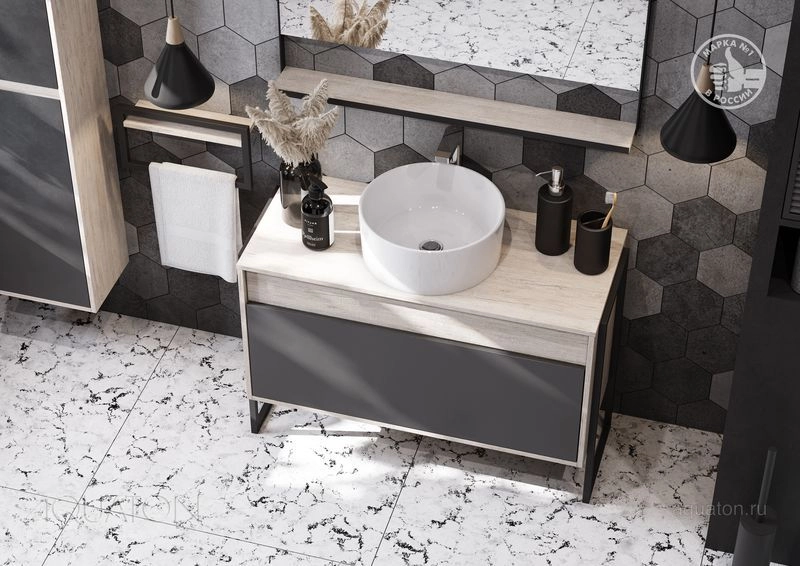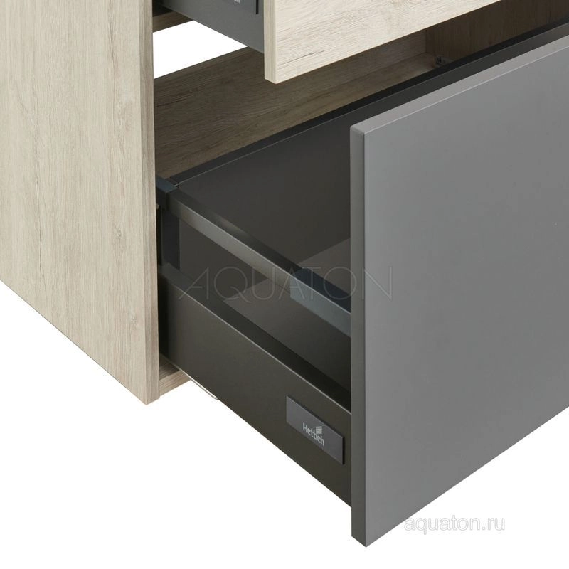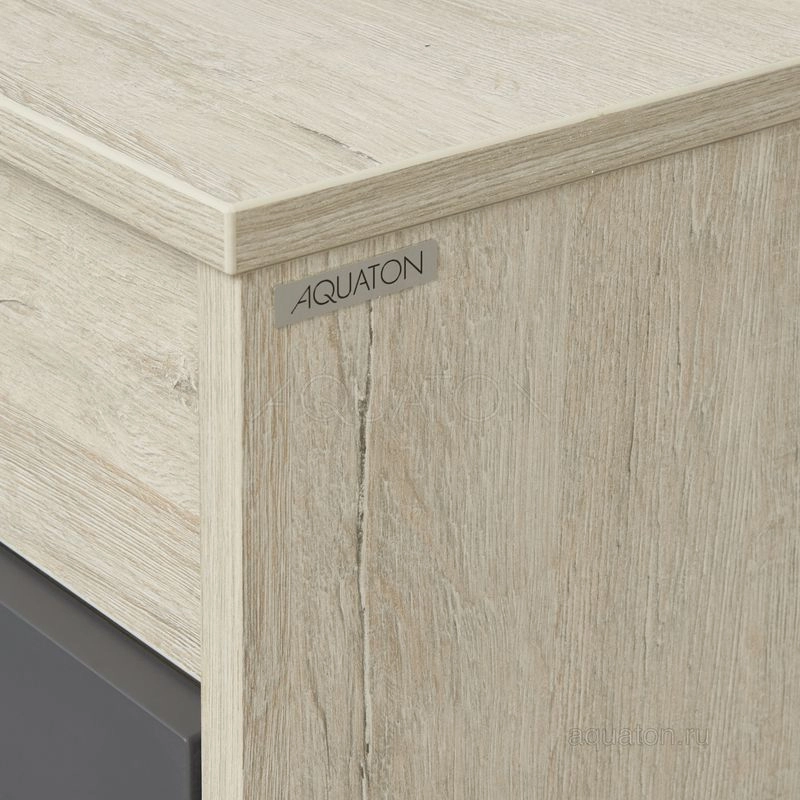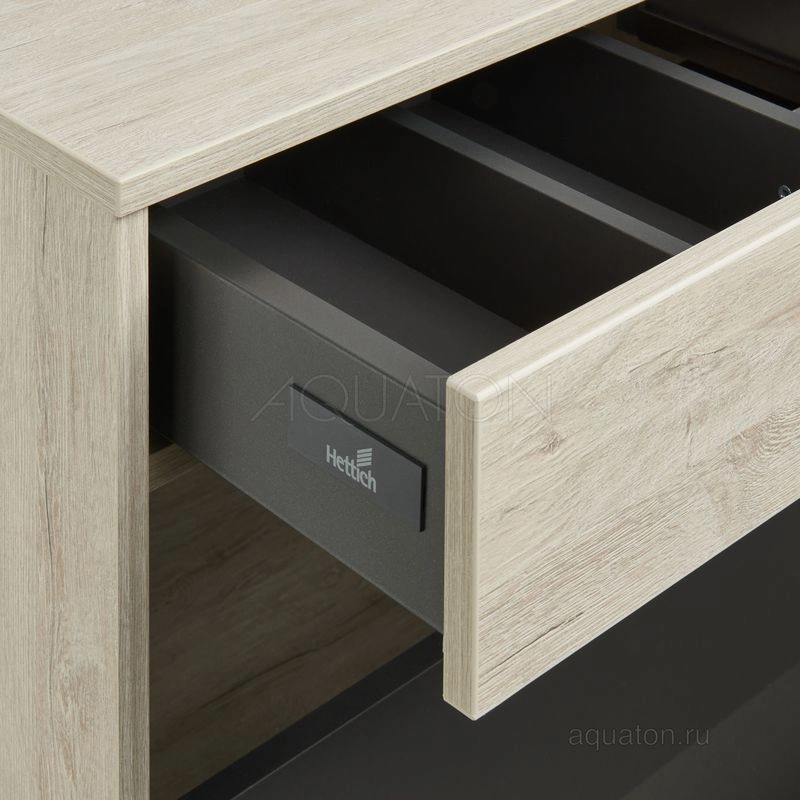 Модуль 100 коллекции Лофт Урбан функционально состоит из двух ящиков полного выдвижения. Верхний ящик тумбы комплектуется внутренней организацией пространства: в нем очень удобно хранить небольшие аксессуары и принадлежности. Вместительный нижний высокий ящик подойдет для более крупных предметов. Функция полного выдвижения ящиков и система открывания push-to-open делают использование тумбы особенно комфортным. Подвесной модуль может комплектоваться различными по размеру и дизайну металлическими черными опорами, высокими и низкими, которые крепятся непосредственно под модуль, кроме того, доступен вариант установки модуля и без опор. Корпус тумбы выполнен из влагостойкой ламинированной ДСП в цвете дуб орегон с текстурой натурального дерева, выгодно подчеркнутым фасадами из МДФ в пленке антрацит с эффектом soft touch.