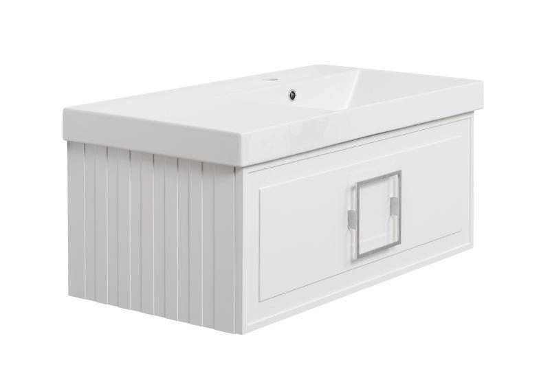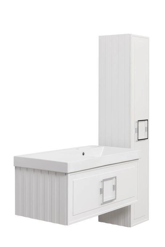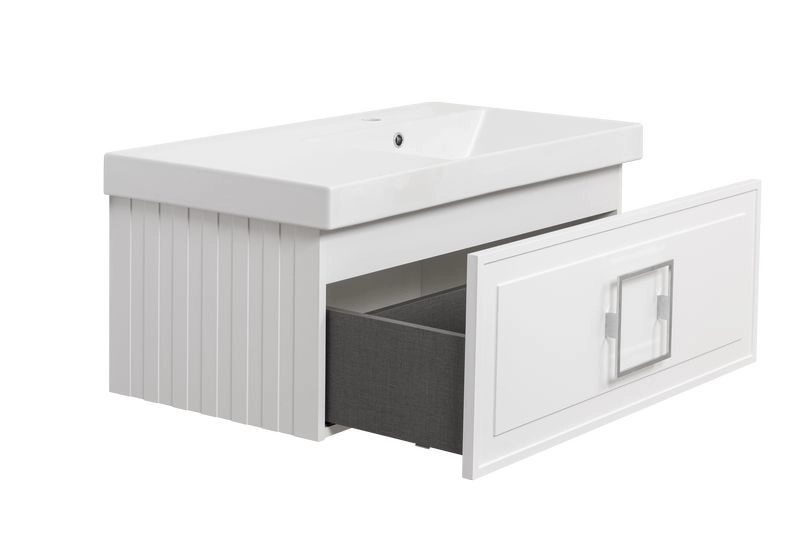 При комплектации изделия можно выбрать столешницу, раковину. Состав комплекта : Тумба, ручка, сифон Prevex, набор для монтажа ( монтажная планка, дюбеля, саморезы)