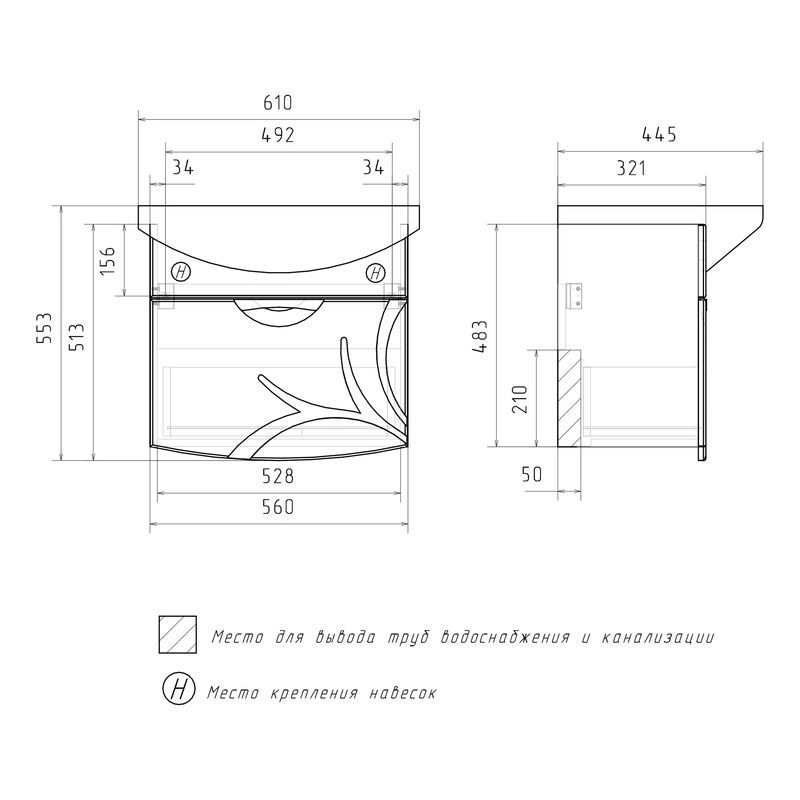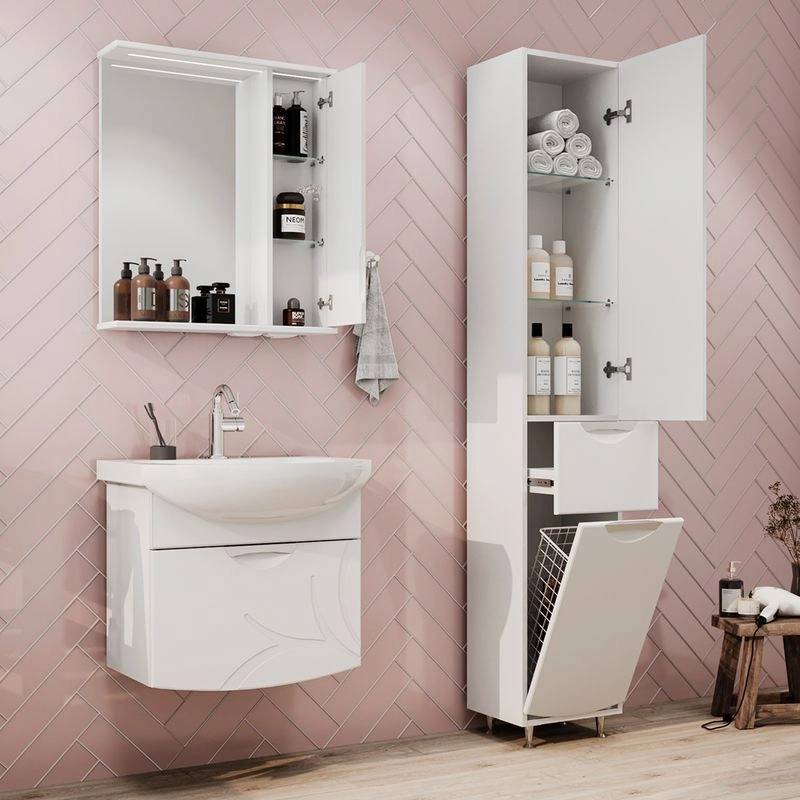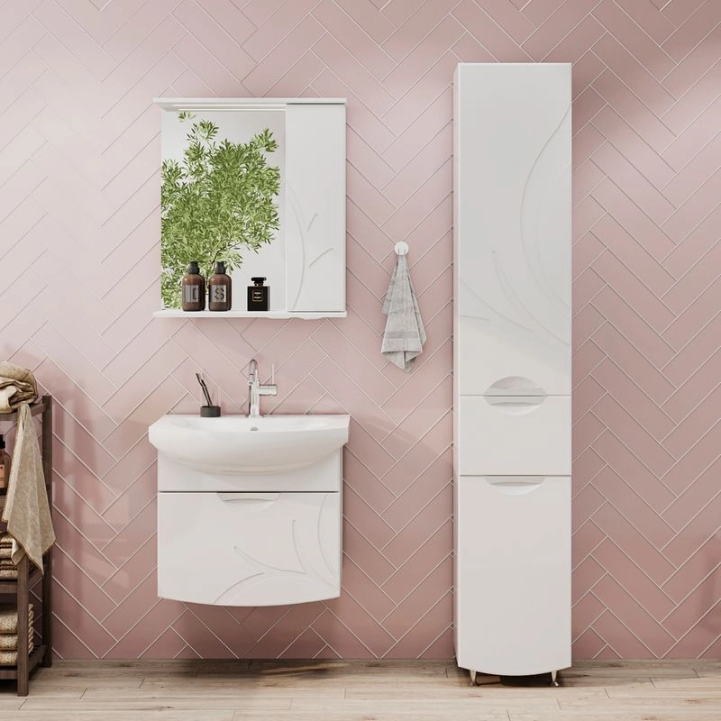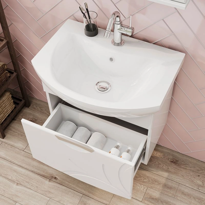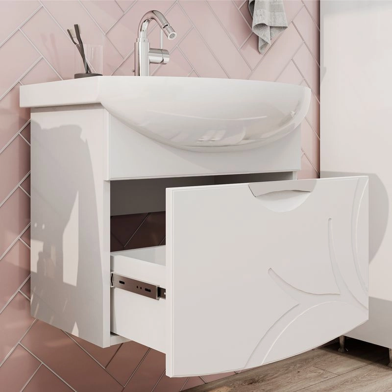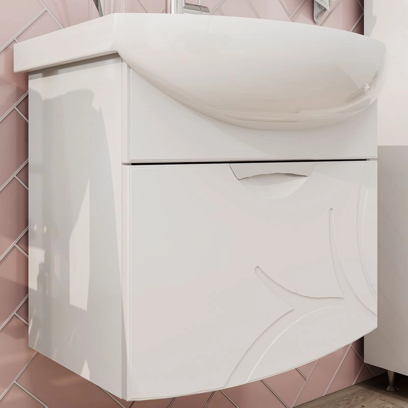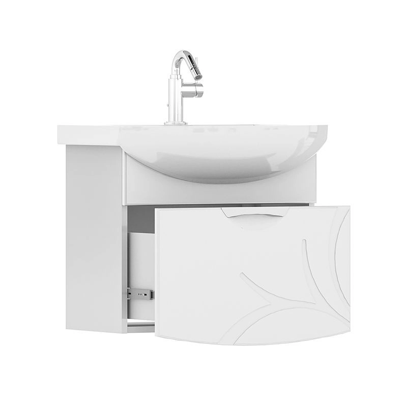 Подвесная тумба с одним выдвижным ящиком с системой плавного закрывания. Фасад тумбы изготовлен из МДФ и облицован глянцевой пленкой ПВХ. Лицевая фурнитура хром. Декоративная фрезеровка на фасаде, фурнитура с системой плавного закрывания
