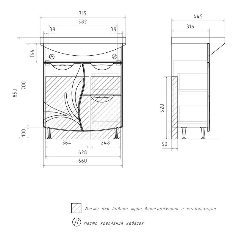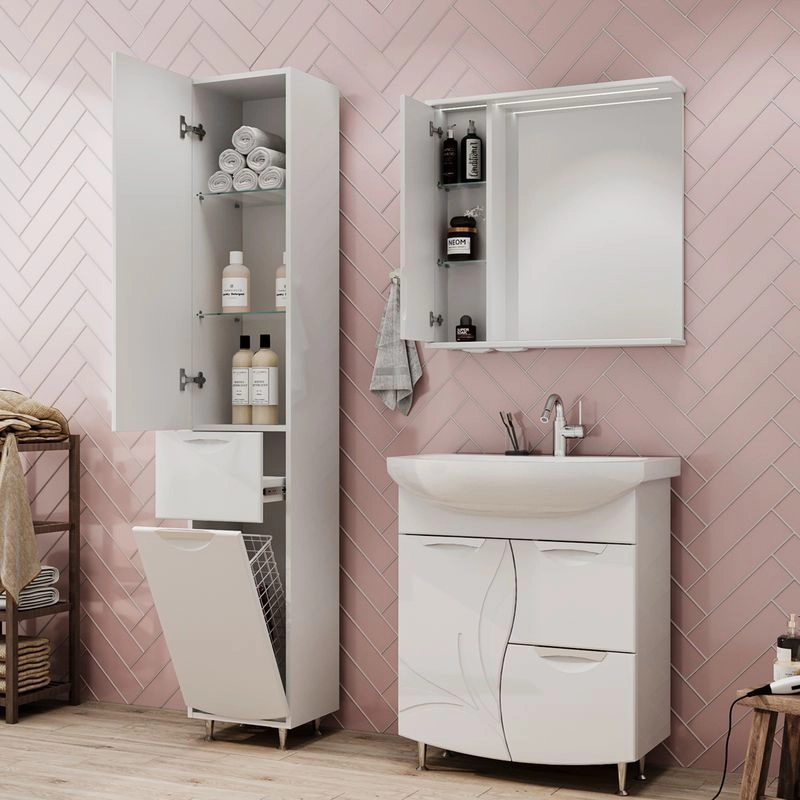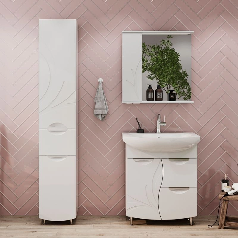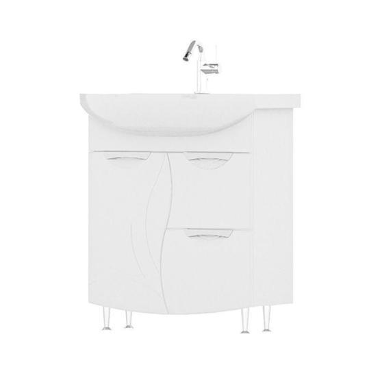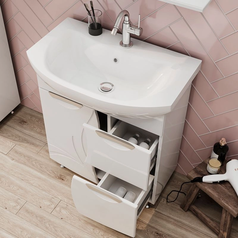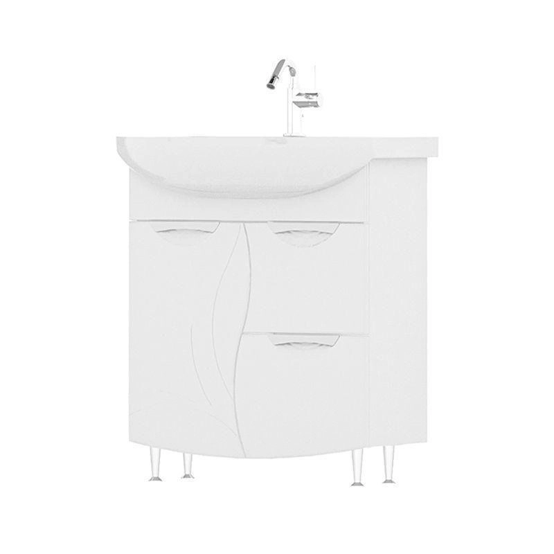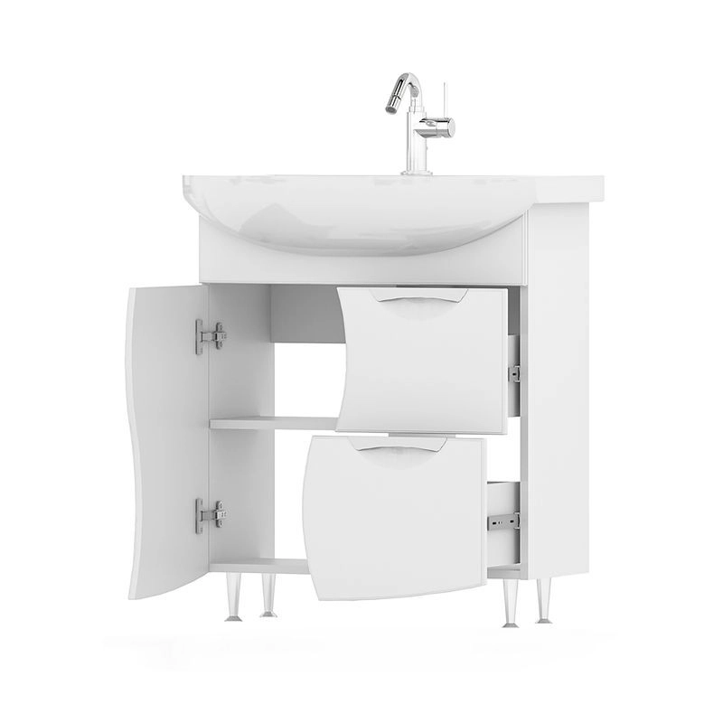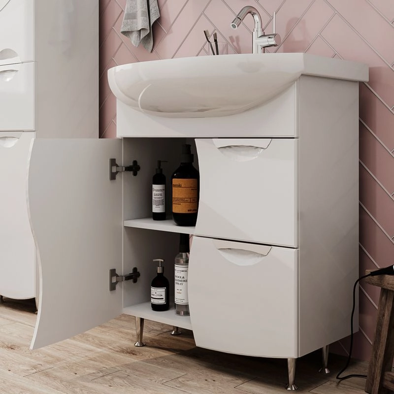 Напольная тумба с одной распашной дверцей и двумя выдвижными ящиками. За распашной дверцей полка из ЛДСП. Фурнитура оснащена доводчиками. Фасады тумбы изготовлены из МДФ, облицованы глянцевой пленкой ПВХ. Лицевая фурнитура хром. Тумба устанавливается на четыре регулируемые опоры и фиксируется к стене при помощи креплений. Декоративная фрезеровка на фасаде, фурнитура с системой плавного закрывания