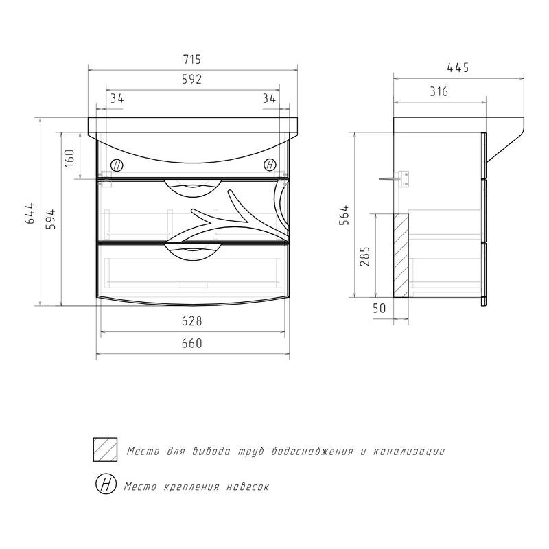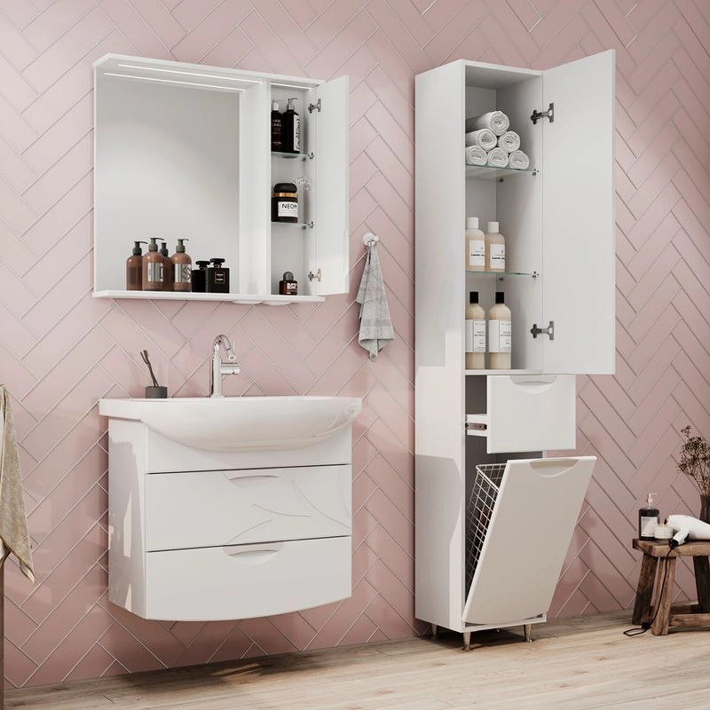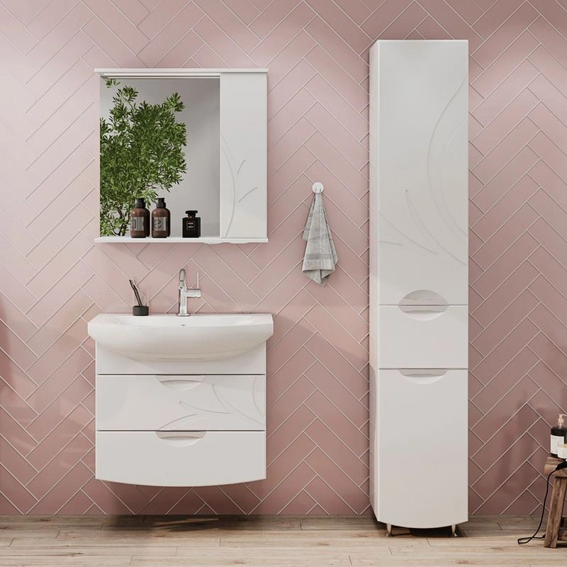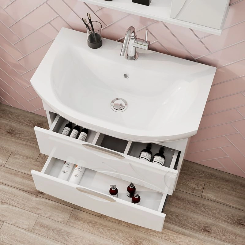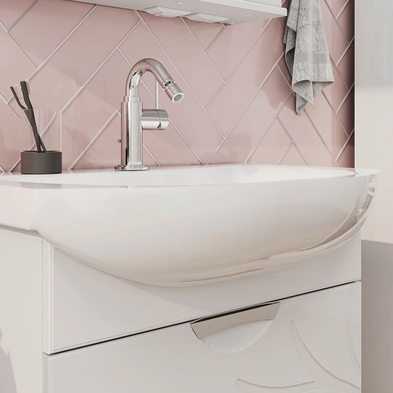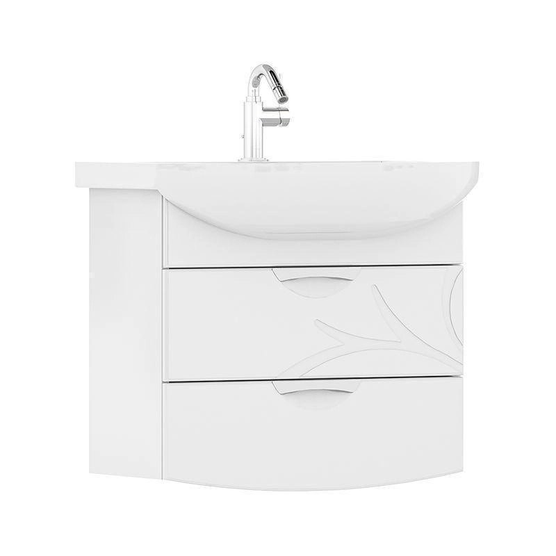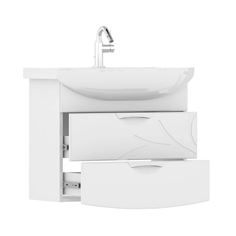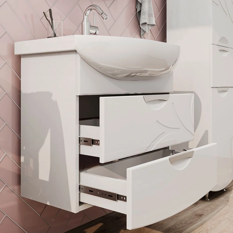 Подвесная тумба с двумя выдвижными ящиками с системой плавного закрывания. Фасады тумбы изготовлены из МДФ и облицованы глянцевой пленкой ПВХ. Лицевая фурнитура хром. Декоративная фрезеровка на фасаде, фурнитура с системой плавного закрывания