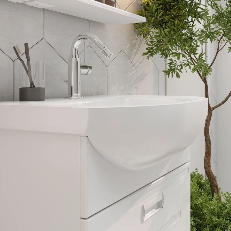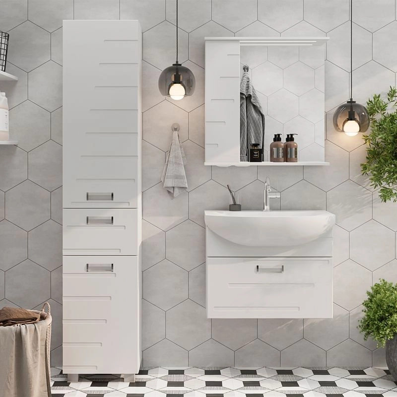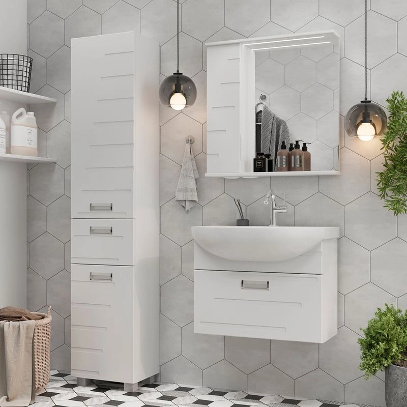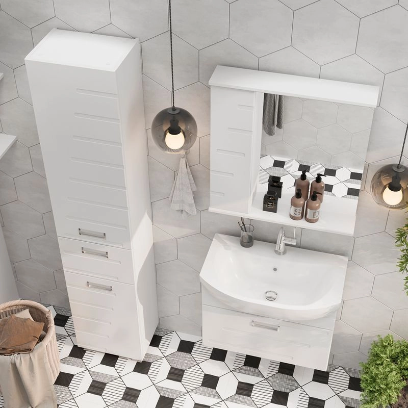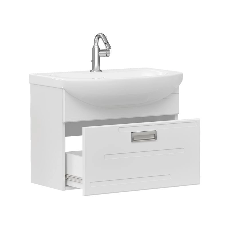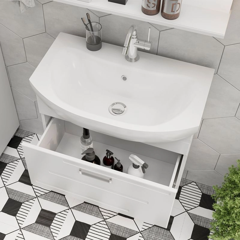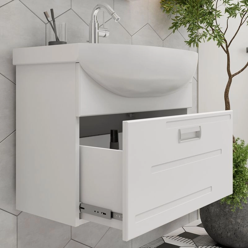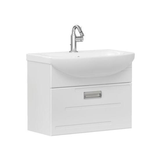 Подвесная тумба с одним выдвижным ящиком с системой плавного закрывания. Фасад тумбы изготовлен из МДФ и облицован глянцевой пленкой ПВХ. Лицевая фурнитура серебро/хром. Декоративная фрезеровка на фасаде, фурнитура с системой плавного закрывания