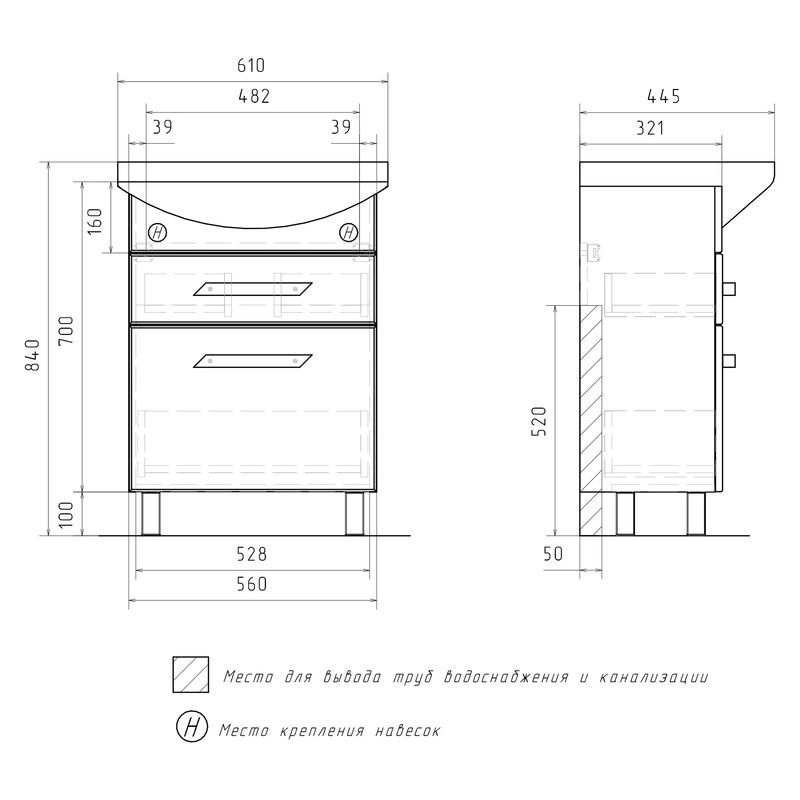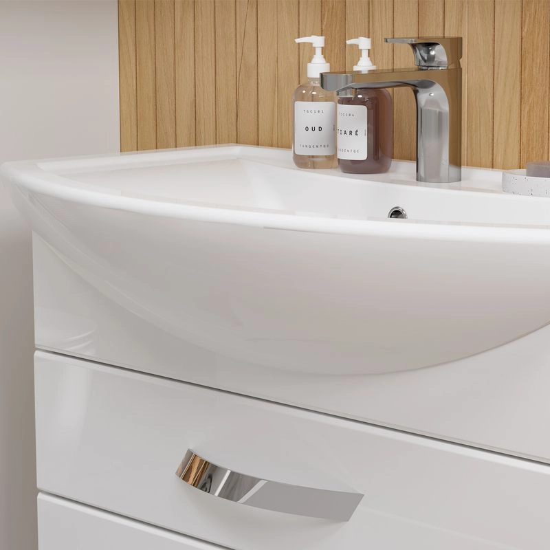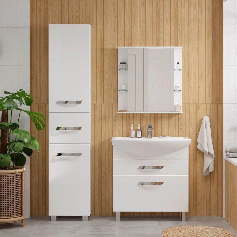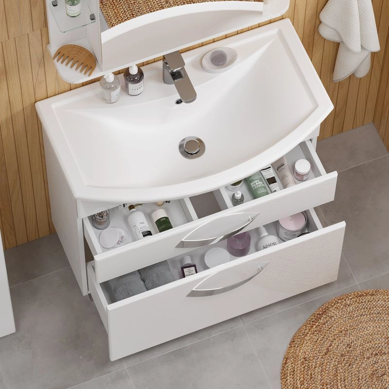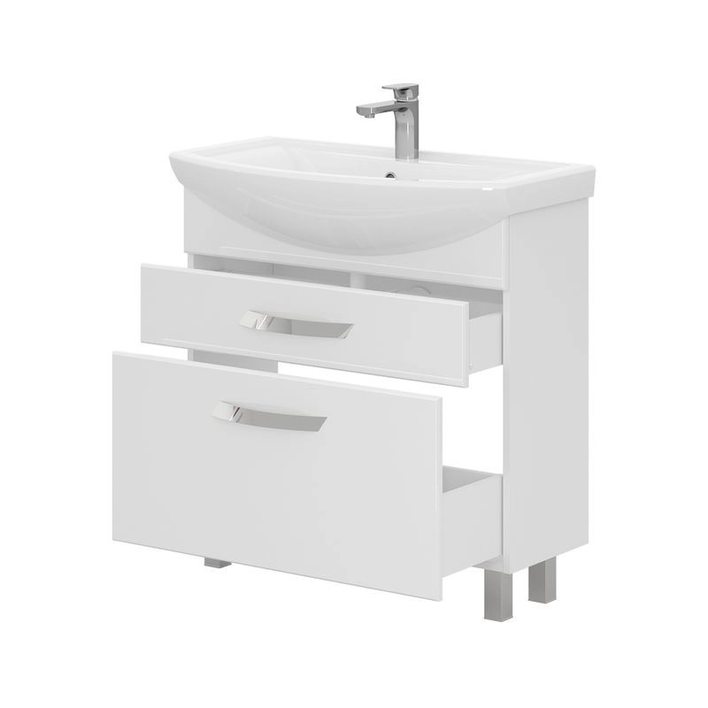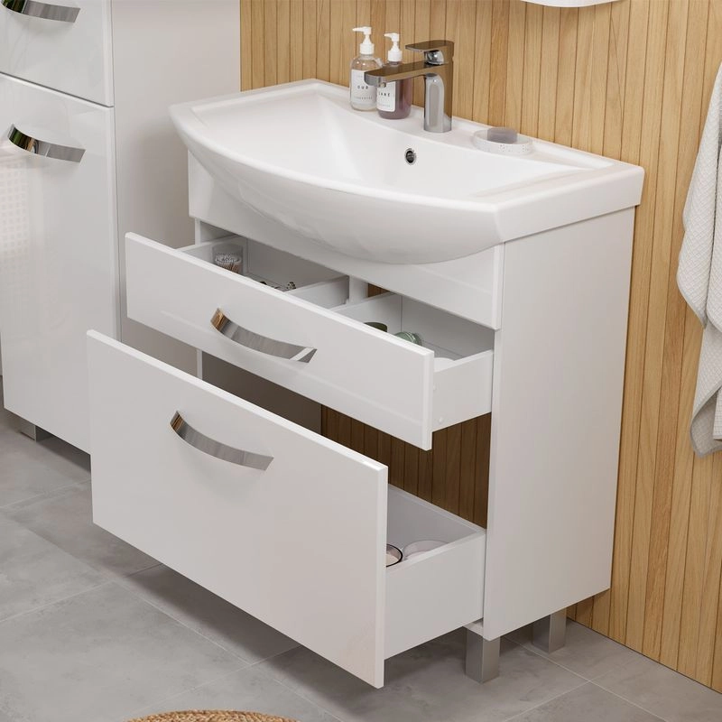 Напольная тумба с двумя выдвижными ящиками с системой плавного закрывания. Фасады тумбы изготовлены из МДФ и облицованы глянцевой пленкой ПВХ. Лицевая фурнитура хром.Тумба устанавливается на четыре регулируемые опоры и фиксируется к стене при помощи креплений. Ящики с механизмом плавного закрывания.