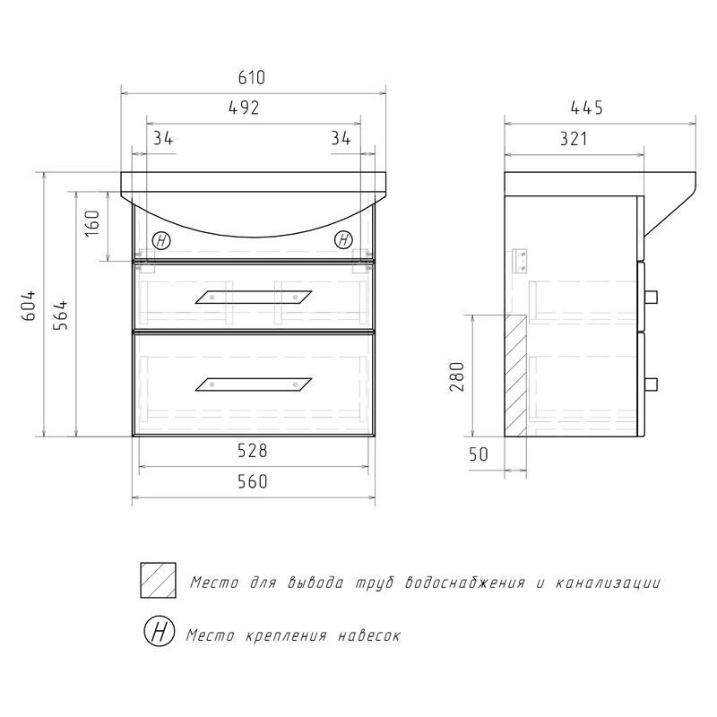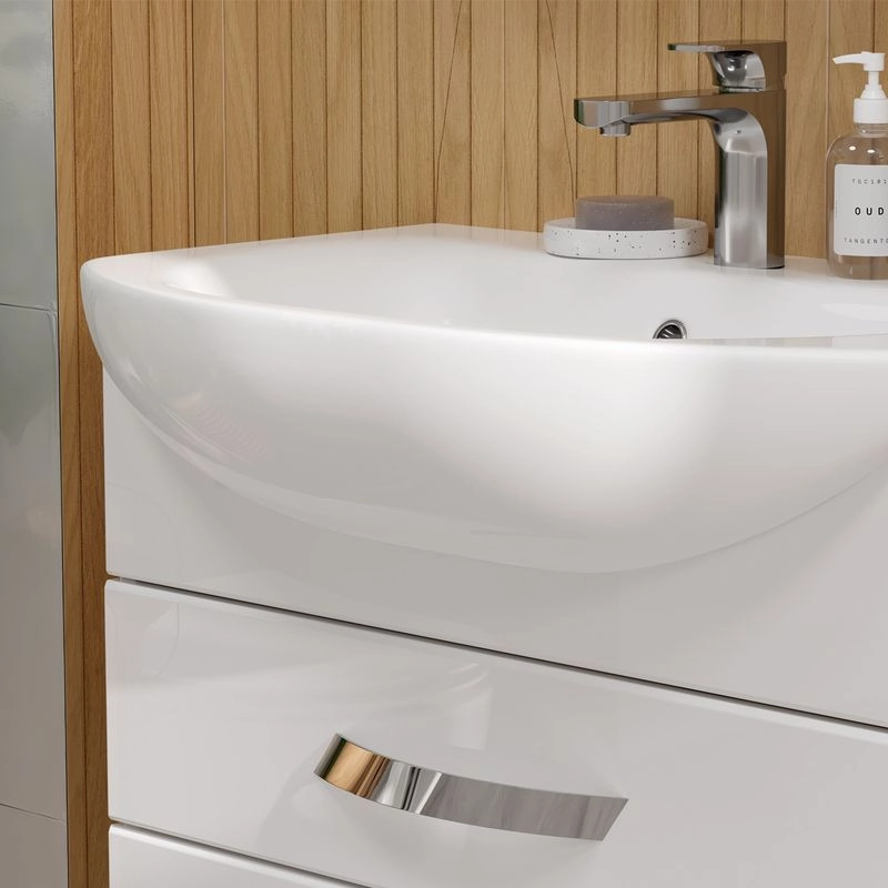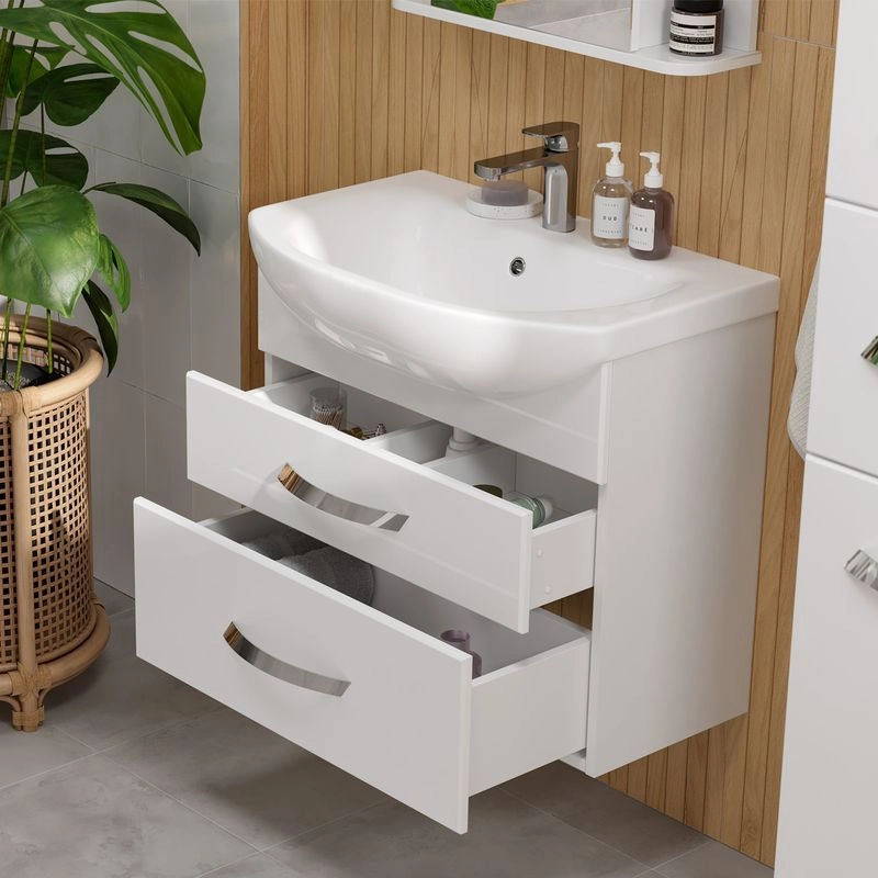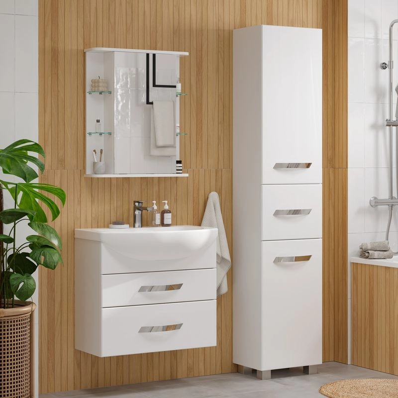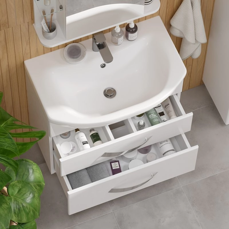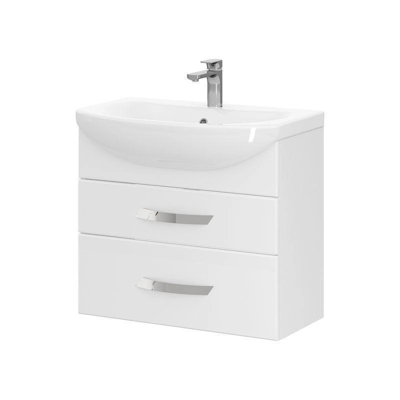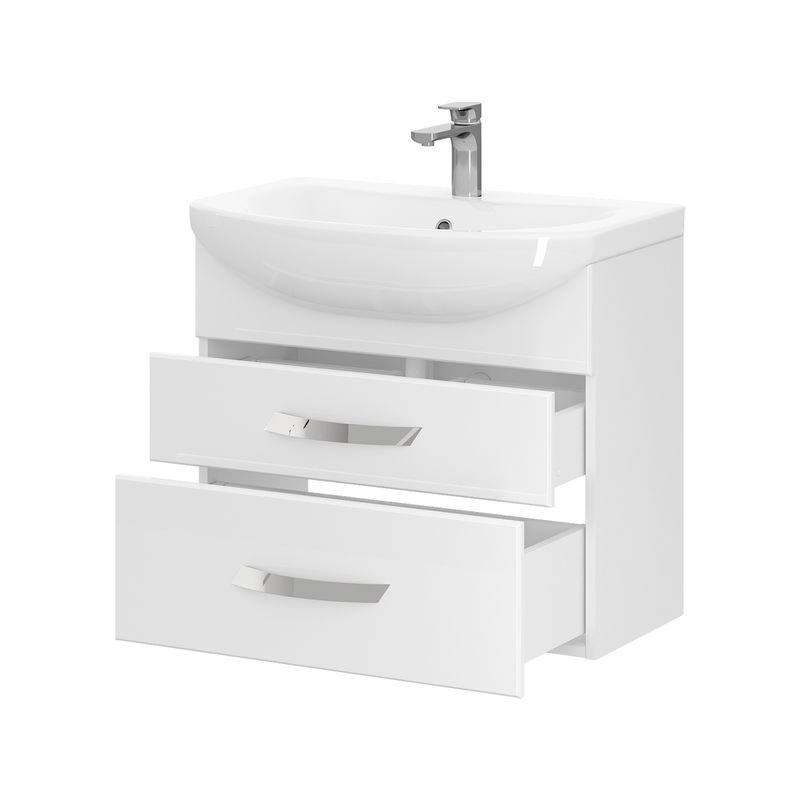 Подвесная тумба с двумя выдвижными ящиками с системой плавного закрывания. Фасады тумбы изготовлены из МДФ и облицованы глянцевой пленкой ПВХ. Лицевая фурнитура хром. Ящики с механизмом плавного закрывания.