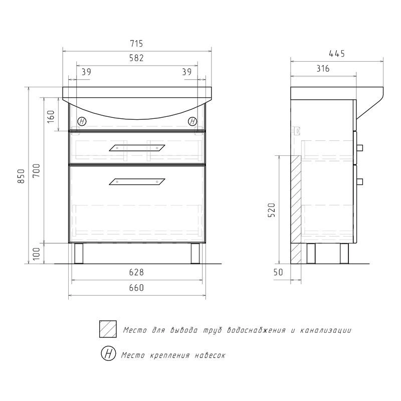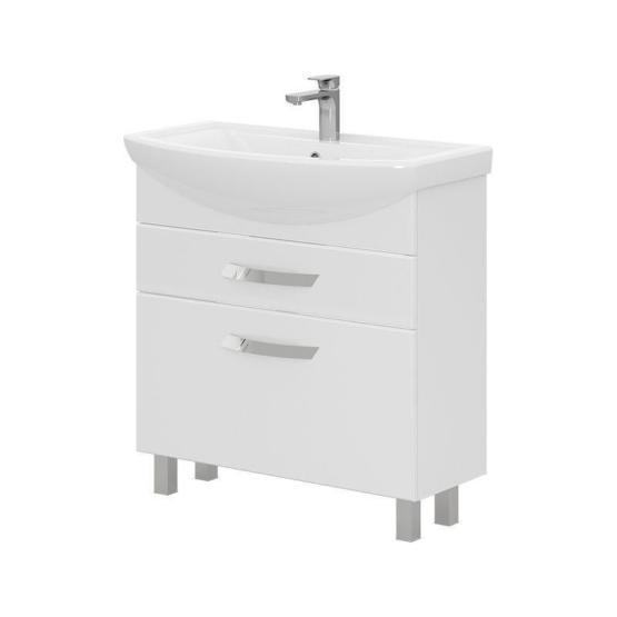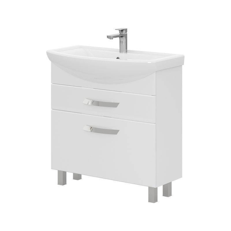 Напольная тумба с двумя выдвижными ящиками с системой плавного закрывания. Фасады тумбы изготовлены из МДФ и облицованы глянцевой пленкой ПВХ. Лицевая фурнитура хром.Тумба устанавливается на четыре регулируемые опоры и фиксируется к стене при помощи креплений. Ящики с механизмом плавного закрывания.