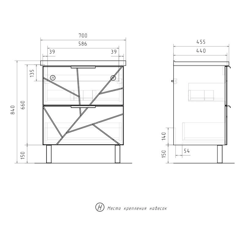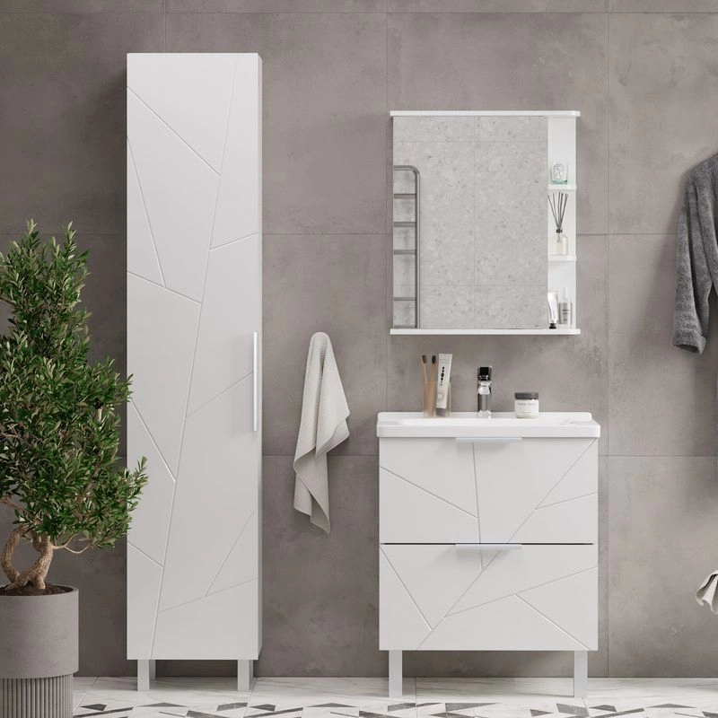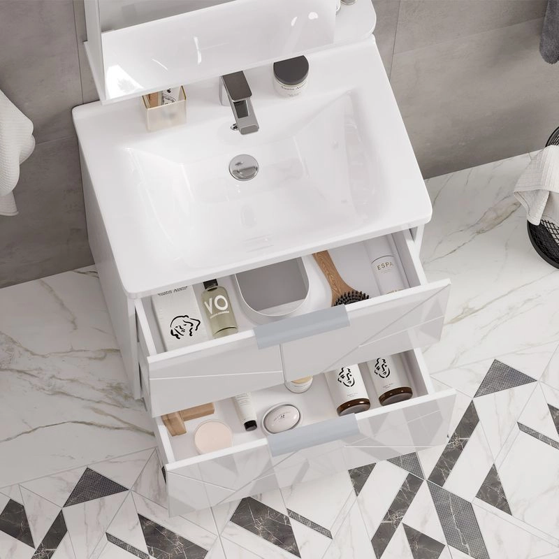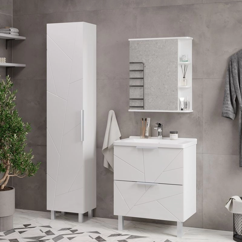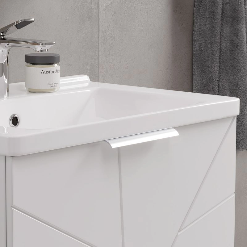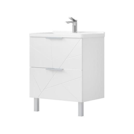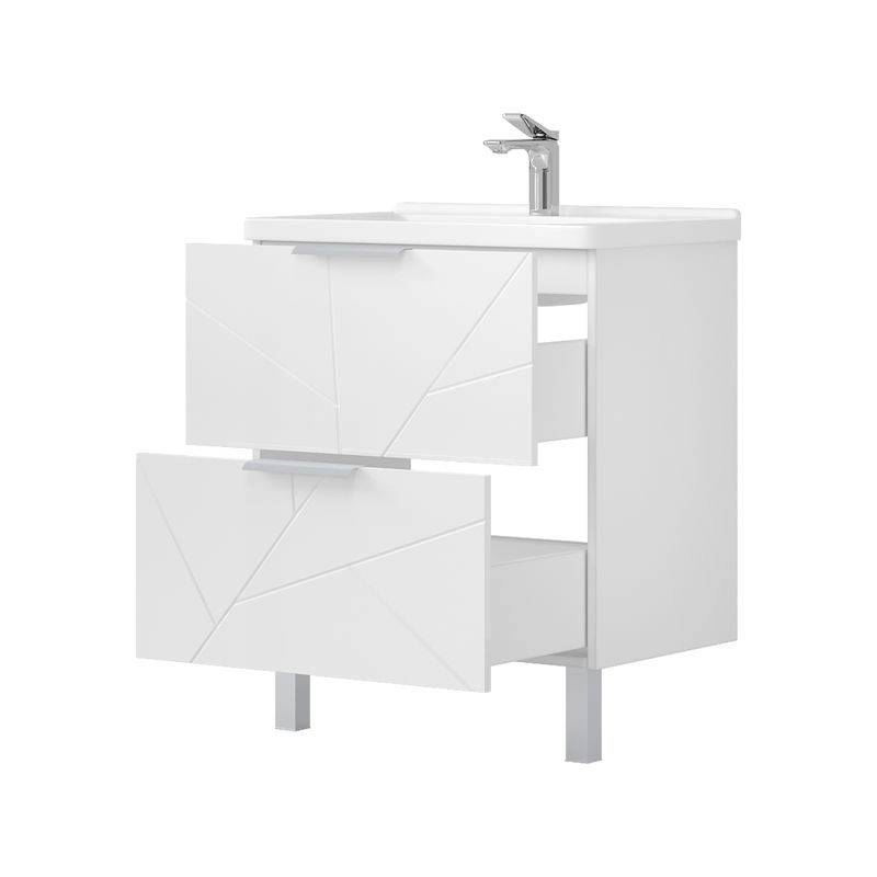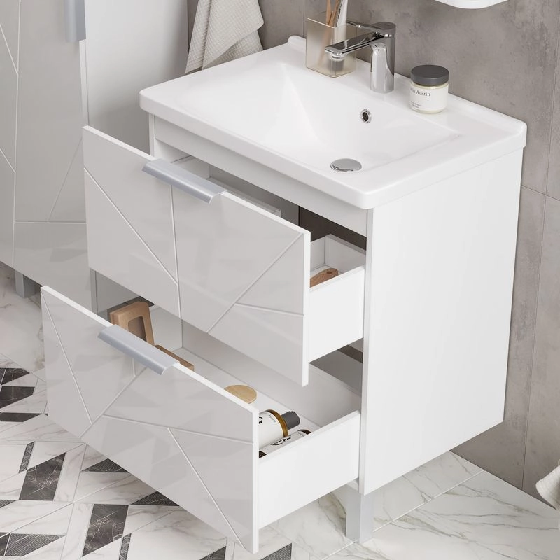 Напольная тумба с двумя выдвижными ящиками с системой плавного закрывания. Фасады тумбы изготовлены из МДФ и облицованы глянцевой пленкой ПВХ. Лицевая фурнитура серый матовый. Тумба устанавливается на две регулируемые опоры и фиксируется при помощи креплений к стене. Декоративная фрезеровка на фасаде, фурнитура с системой плавного закрывания