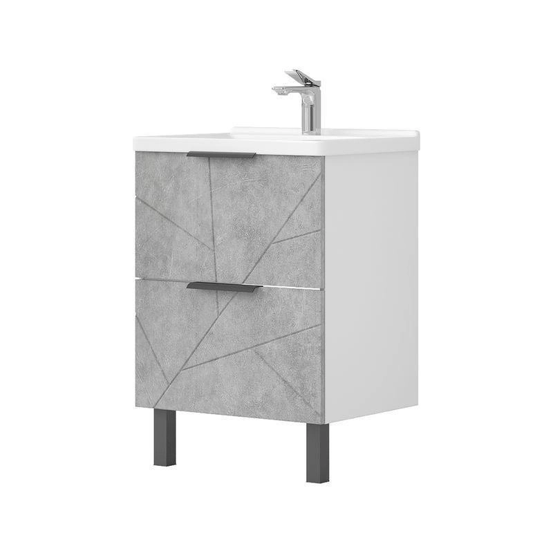 Напольная тумба с двумя выдвижными ящиками с системой плавного закрывания. Фасады тумбы изготовлены из МДФ и облицованы матовой пленкой ПВХ в цвете бетон. Лицевая фурнитура черный матовый. Тумба устанавливается на две регулируемые опоры и фиксируется при помощи креплений к стене. Декоративная фрезеровка на фасаде, фурнитура с системой плавного закрывания