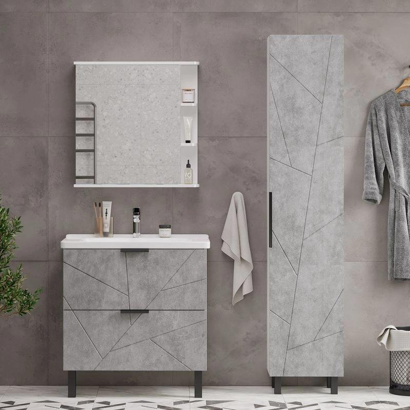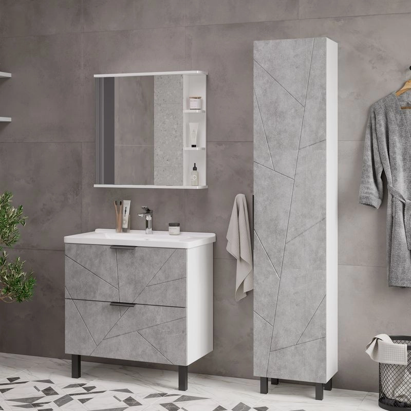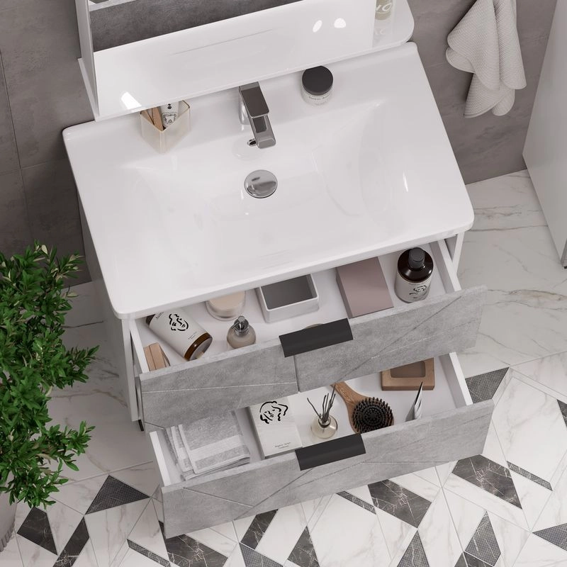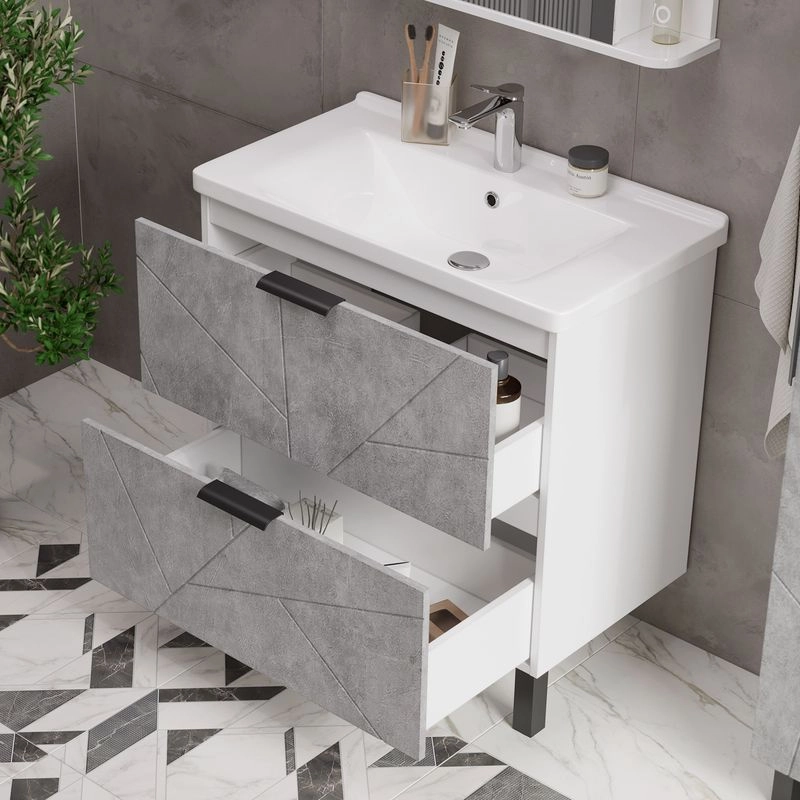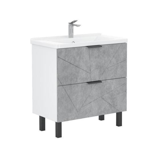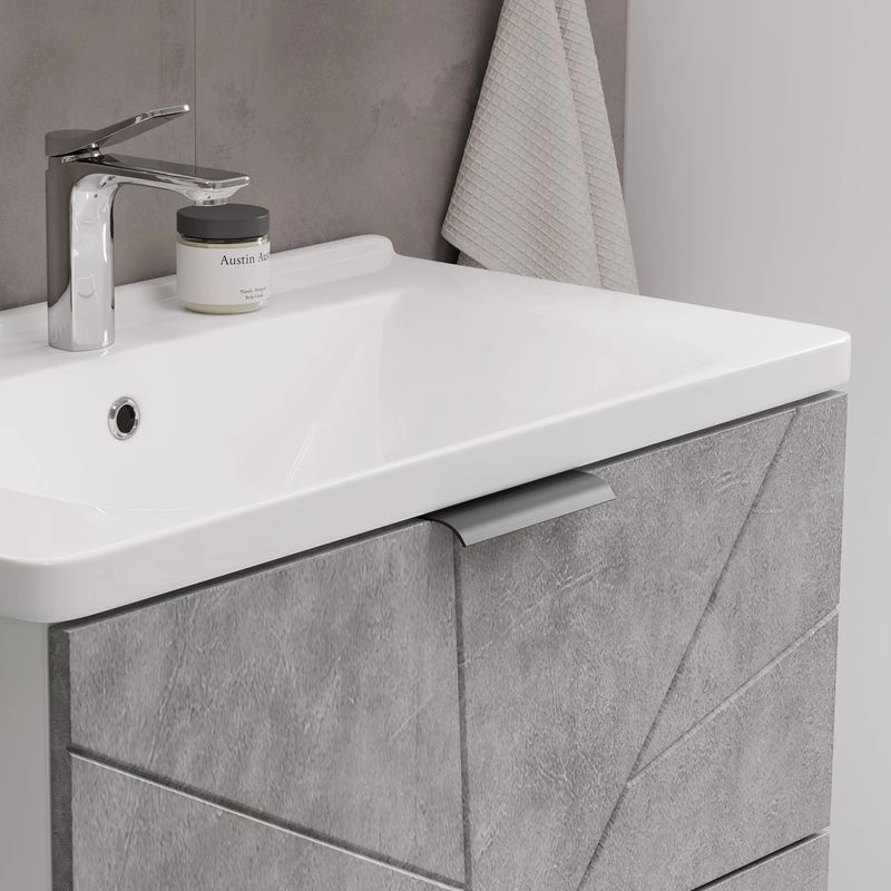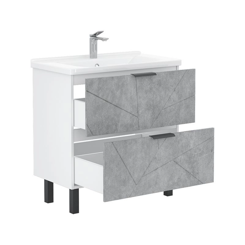 Напольная тумба с двумя выдвижными ящиками с системой плавного закрывания. Фасады тумбы изготовлены из МДФ и облицованы матовой пленкой ПВХ в цвете бетон. Лицевая фурнитура черный матовый. Тумба устанавливается на две регулируемые опоры и фиксируется при помощи креплений к стене. Декоративная фрезеровка на фасаде, фурнитура с системой плавного закрывания