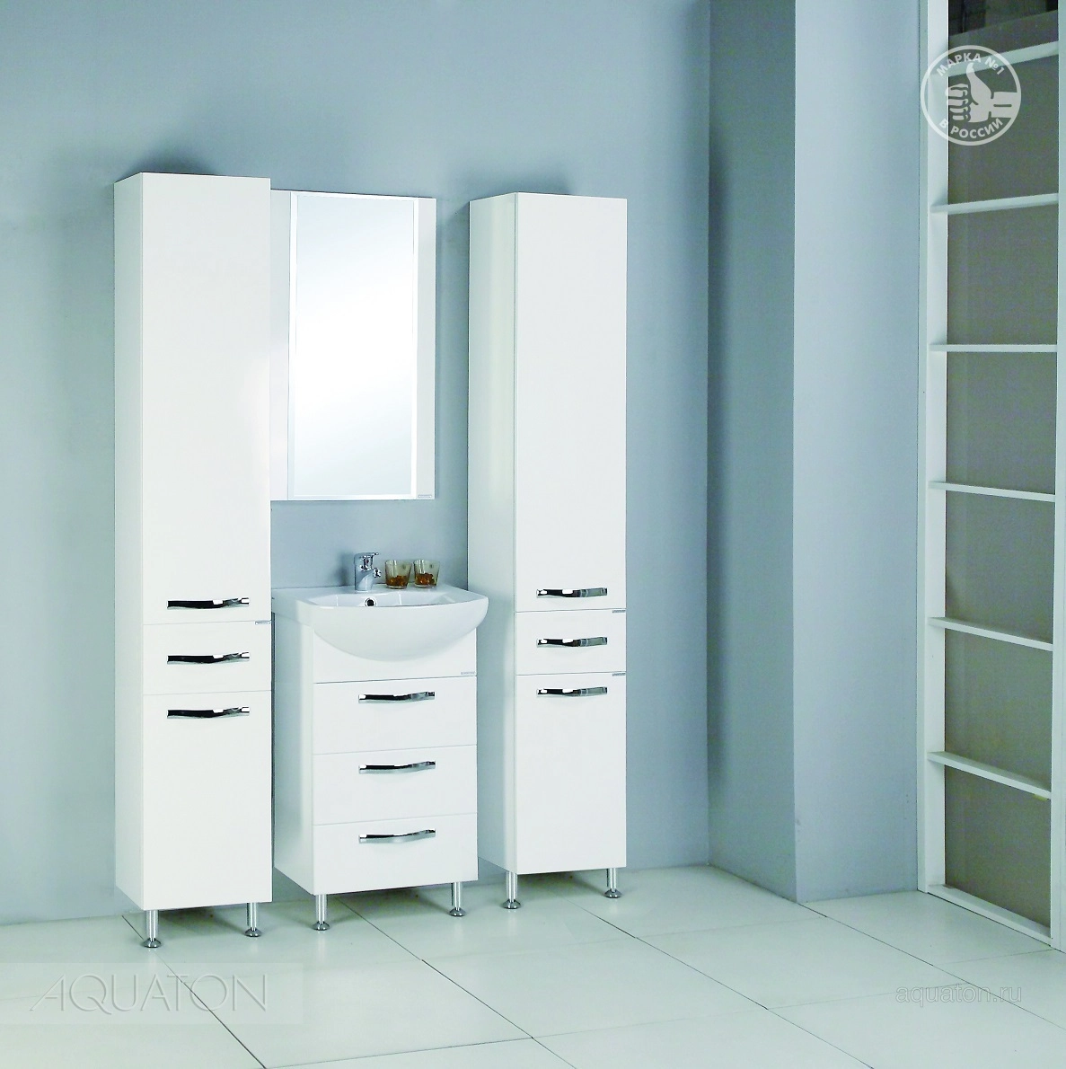 Aquaton 1A140201AA010 Модификация модели Ария. Тумба и колонна устанавливаются на пол при помощи регулируемых по высоте ножек. В тумбе три выдвижных ящика из влагостойкой ДСП, верхний из которых снабжен организацией пространства. В колонне внизу расположен откидной фасад с бельевой корзиной, а за верхним распашным фасадом расположены регулируемые по высоте полочки. Зеркало выполнено в популярном стиле минимализма, не занимает много места и при желании может быть укомплектовано полкой Ария 50. Комплектация: ручки – 3 ящики в декоративной отделке - 3 шариковые направляющие навесы - 2 ножки - 2 Габариты ш*в*г (мм) 470*833*309