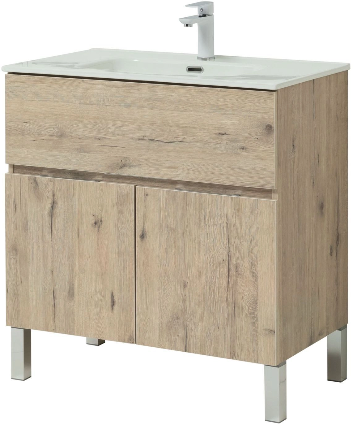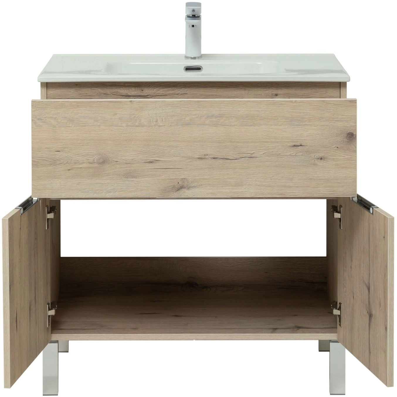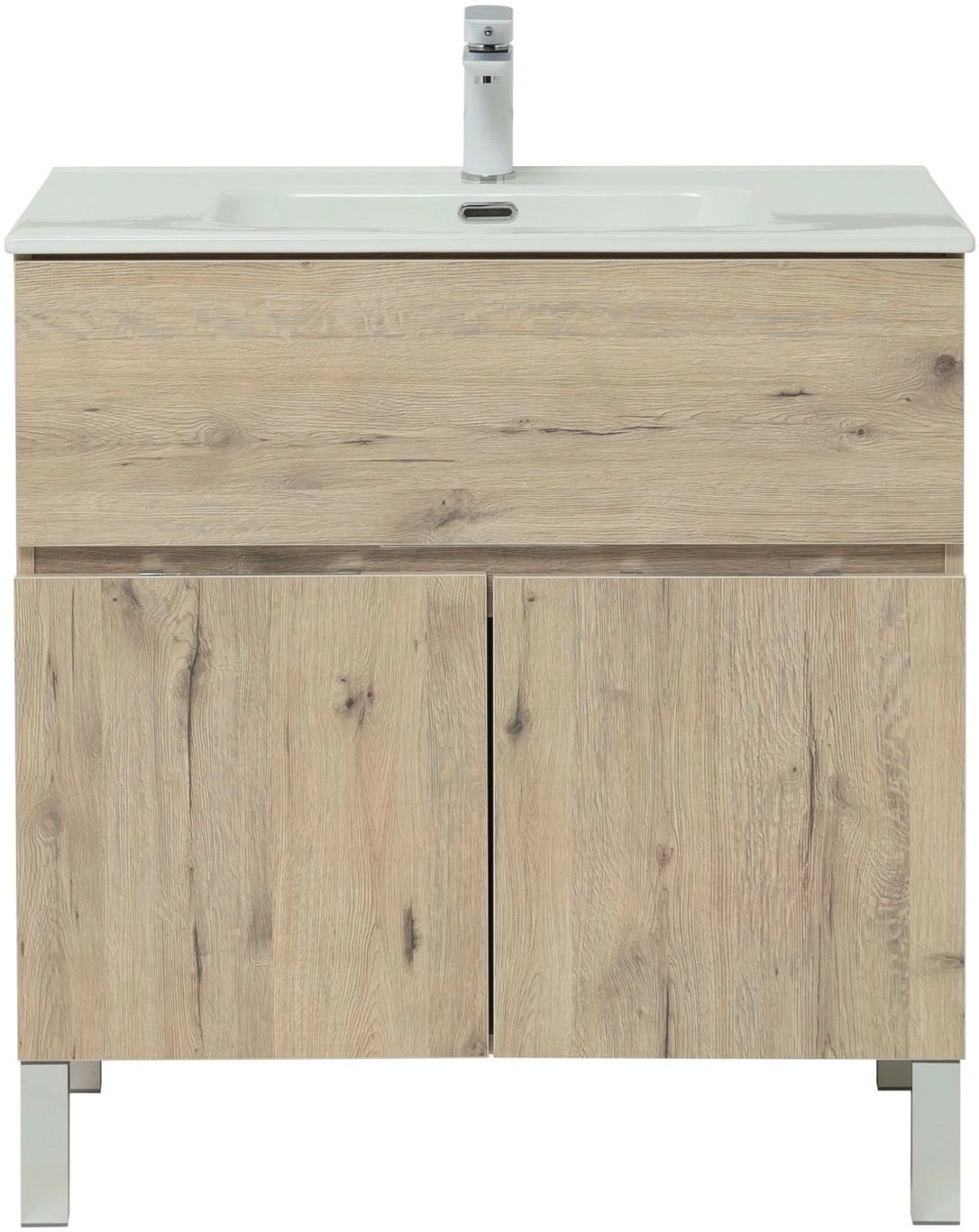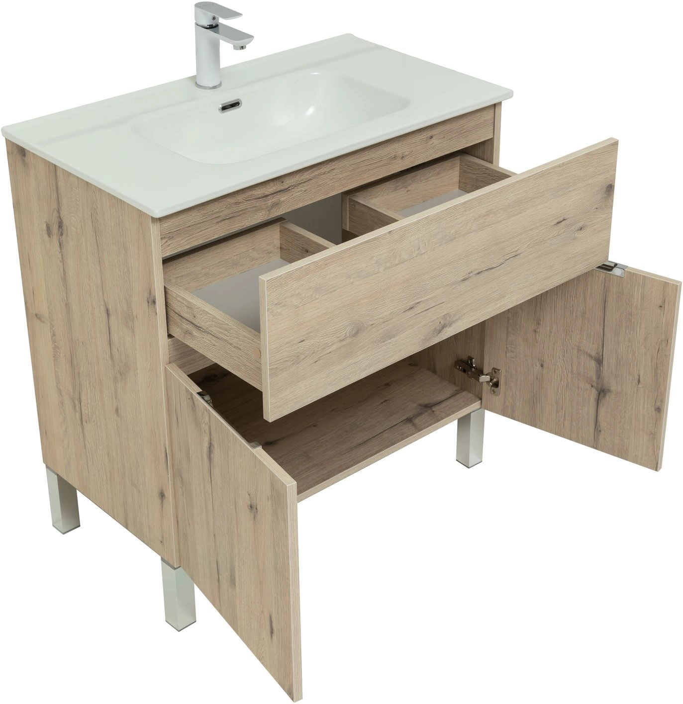 Тумба Aquanet «Алвита» New 80 — напольная модель, которую устанавливают на ножки. Мебель дополнена одним ящиком, расположенным в верхней части, а также двумя дверцами. За ними — вместительный отсек, разделенный на две половины полкой. Пространства достаточно, чтобы хранить принадлежности для гигиены, стирки и уборки. Потайные ручки придают фасаду эстетичный внешний вид, обеспечивают безопасность эксплуатации детьми и взрослыми. Раковина Aquanet Flat 80 выполнена из керамики. Материал экологичный, гладкий и приятный на ощупь, легко очищается от грязи неабразивными средствами. Удобство гарантируют широкие бортики по периметру. На них можно поставить стакан с зубной щеткой и пастой, мыльницу или дозатор. В дополнение к комплекту рекомендуем приобрести пенал «Алвита» New 35, смеситель 5.21001-00 и донный клапан 5.21026-31 от производителя Allen Brau.