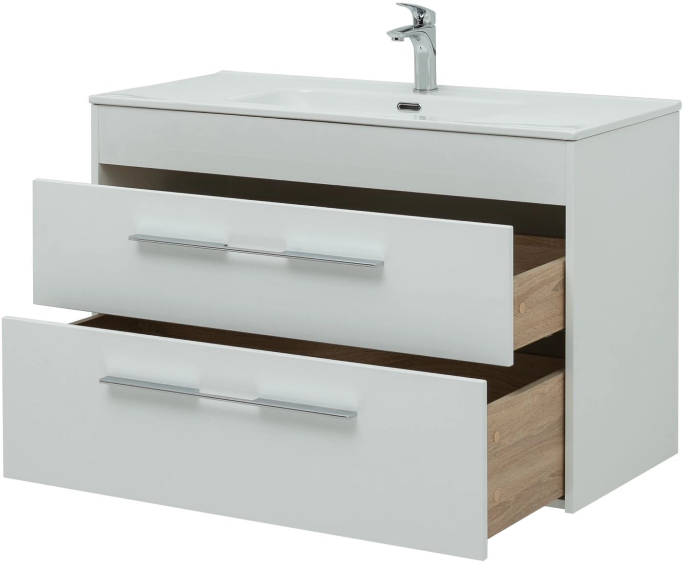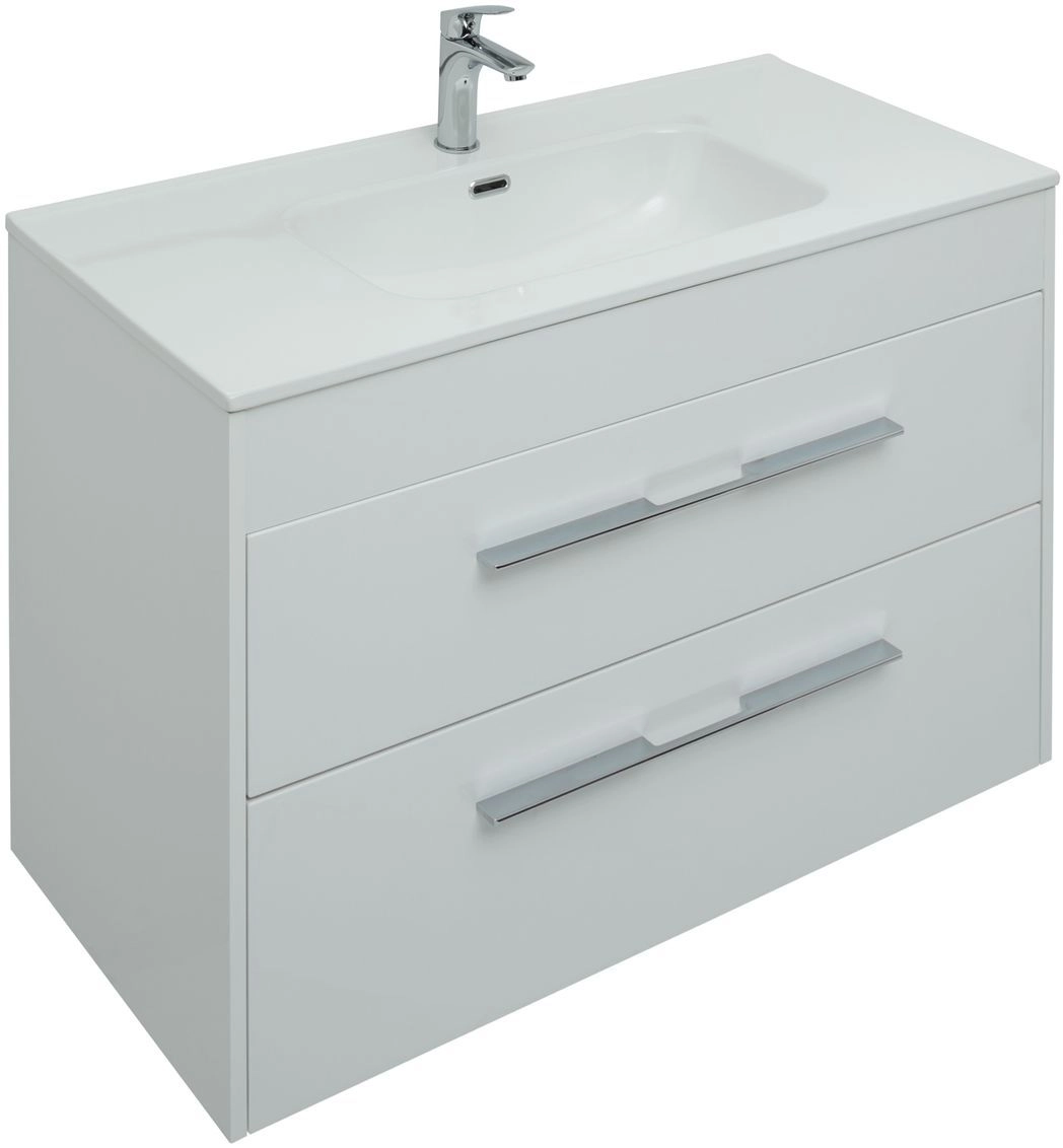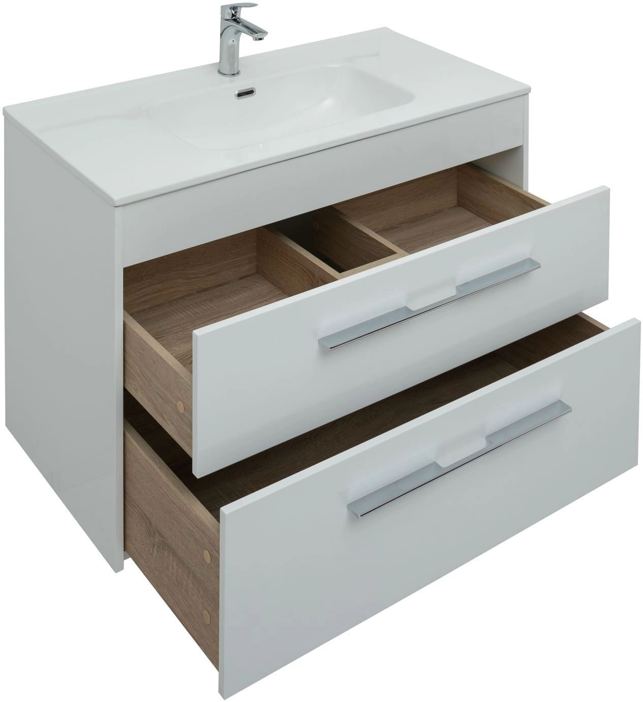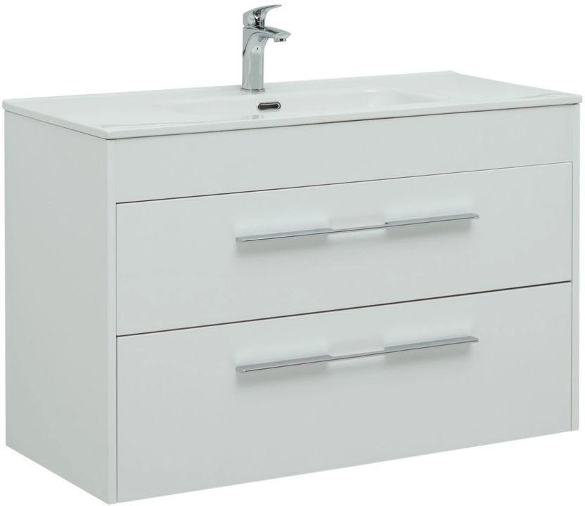 Тумба под раковину Aquanet Августа шириной 100 см — ультрамодное решение для современных санузлов. Универсальная глянцевая модель в белом исполнением с двумя выдвижными ящиками поможет вам организовать пространство под раковиной. Подвесная конструкция крепится к стене, оставляя пространство под собой для уборки. Фасад тумбы изготовлен из МДФ, а корпус — из влагостойкого ЛДСП. Производители позаботились о том, чтобы организация пространства внутри ящичков соответствовало сливной конструкции, соединяющей раковину с системой водоотведения. Однако это нисколько не помешает вам хранить внутри предметы бытовой химии и косметику. На тумбочку нанесено ламинированное покрытие, а фурнитура выполнена в цвете «хром».