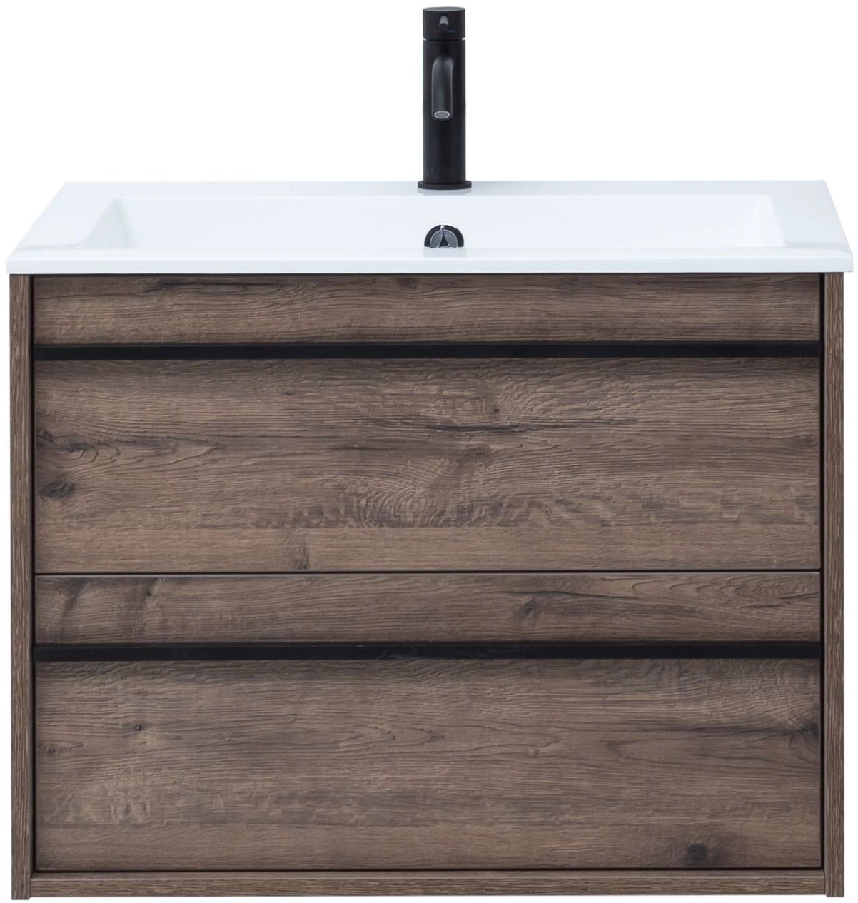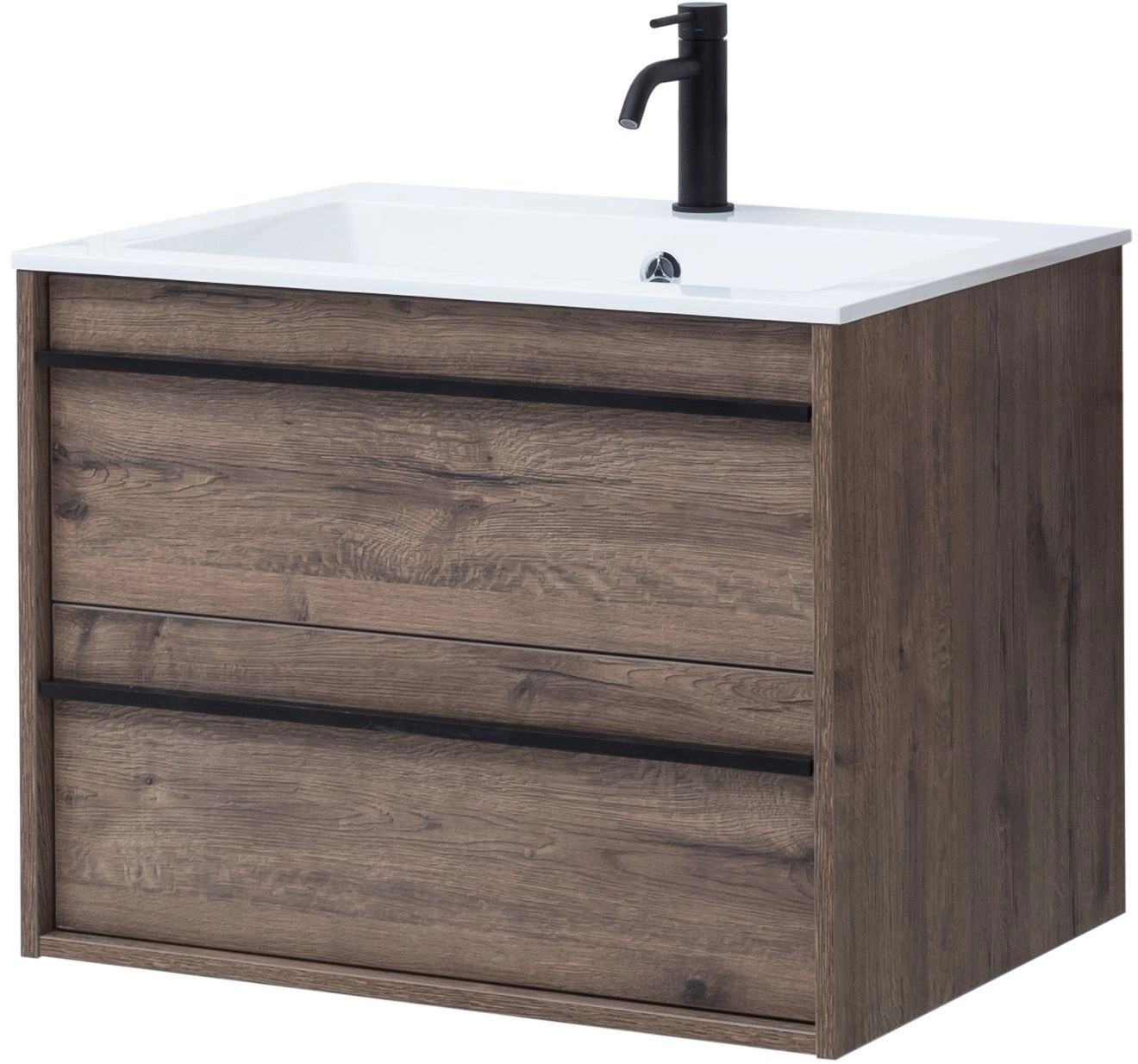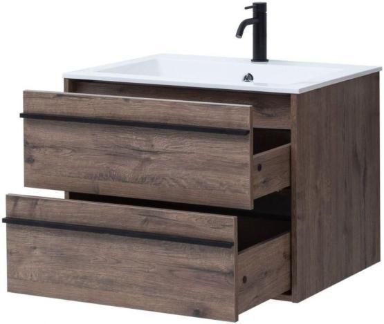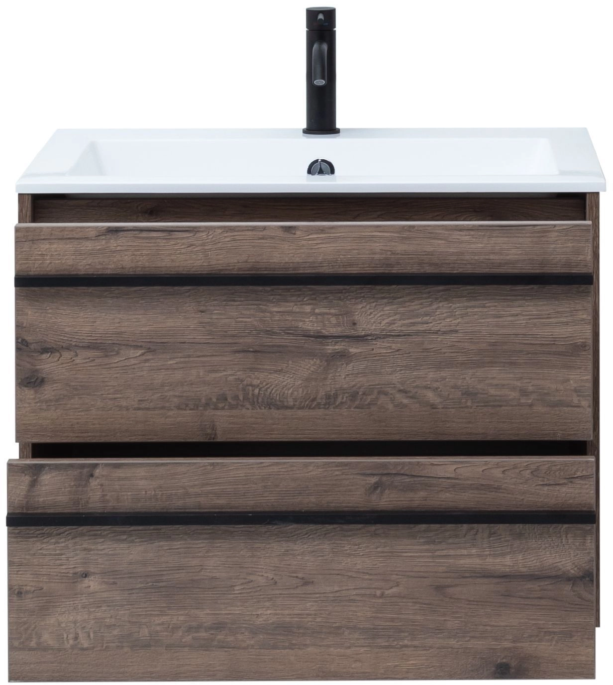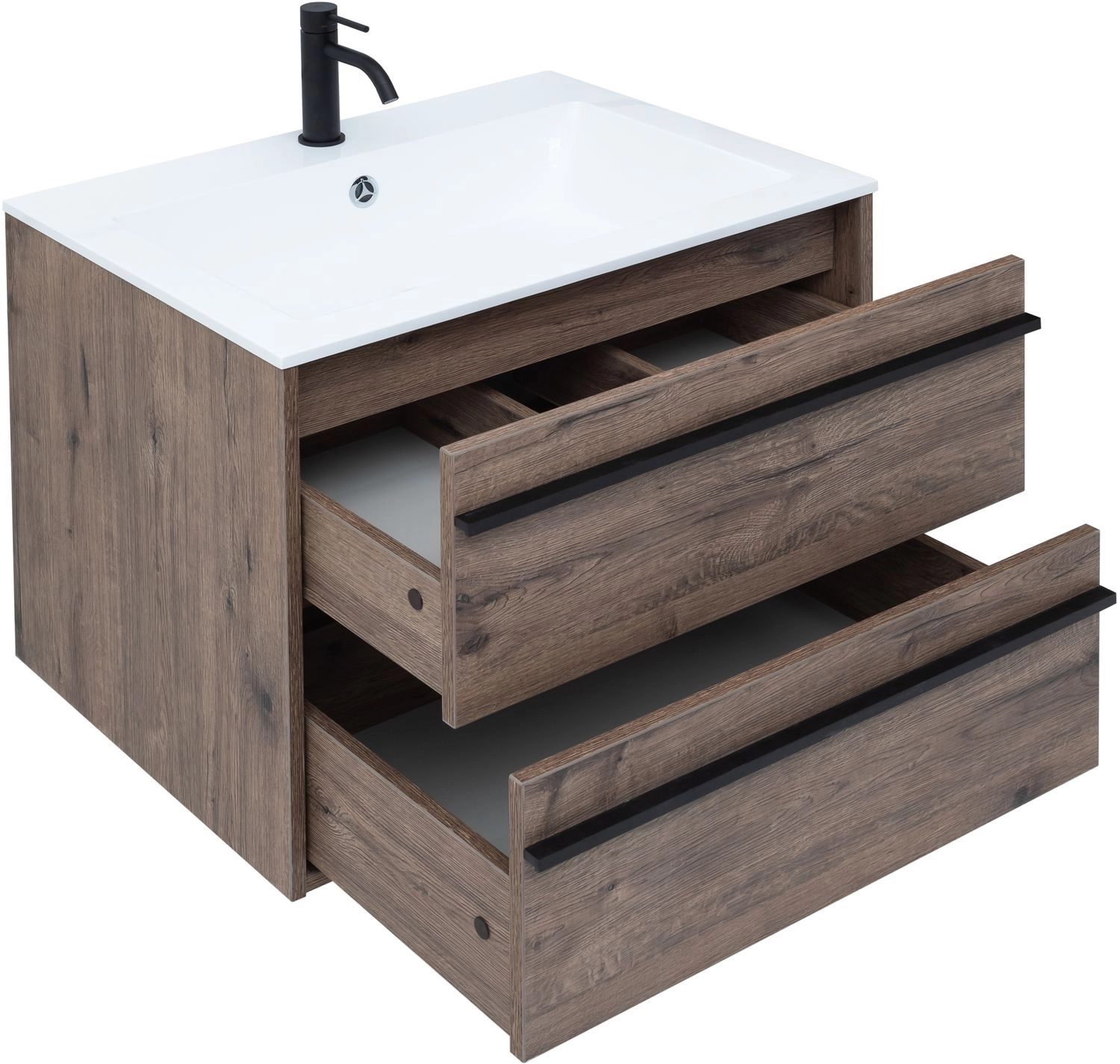 Тумба под раковину Aquanet Lino 70 в цвете "дуб веллингтон" - яркий пример мебели в эко-стиле. Яркая, приятная глазу цветовая гамма плюс текстурная поверхность, максимально приближенная по тактильным ощущениям к натуральной древесной поверхности, является визитной карточкой коллекции. У нее удобная зона хранения: два выдвижных ящика, оборудованных доводчиками, словно утоплены внутрь корпуса. Тонкие изящные ручки во всю ширину ящиков. Именно они находятся в одной плоскости с боковыми стенками. Выглядит стильно. К тому же, безопасно, так как нет выступающих деталей. Кстати, ручки отечественного производства. Сделаны из алюминия, чтобы исключить возможность коррозии, по заказу Aquanet специально для этой коллекции. Сверху на них нанесено эмалевое покрытие. Корпус и фасады тумбы шириной 70 см – из влагостойкого ЛДСП. Сверху установлена раковина «Электра» из литьевого мрамора. У нее максимально глубокая и объемная чаша, но все внутренние детали скруглены, так что приведение ее в порядок не составит труда, так как грязь не будет скапливаться в уголках.