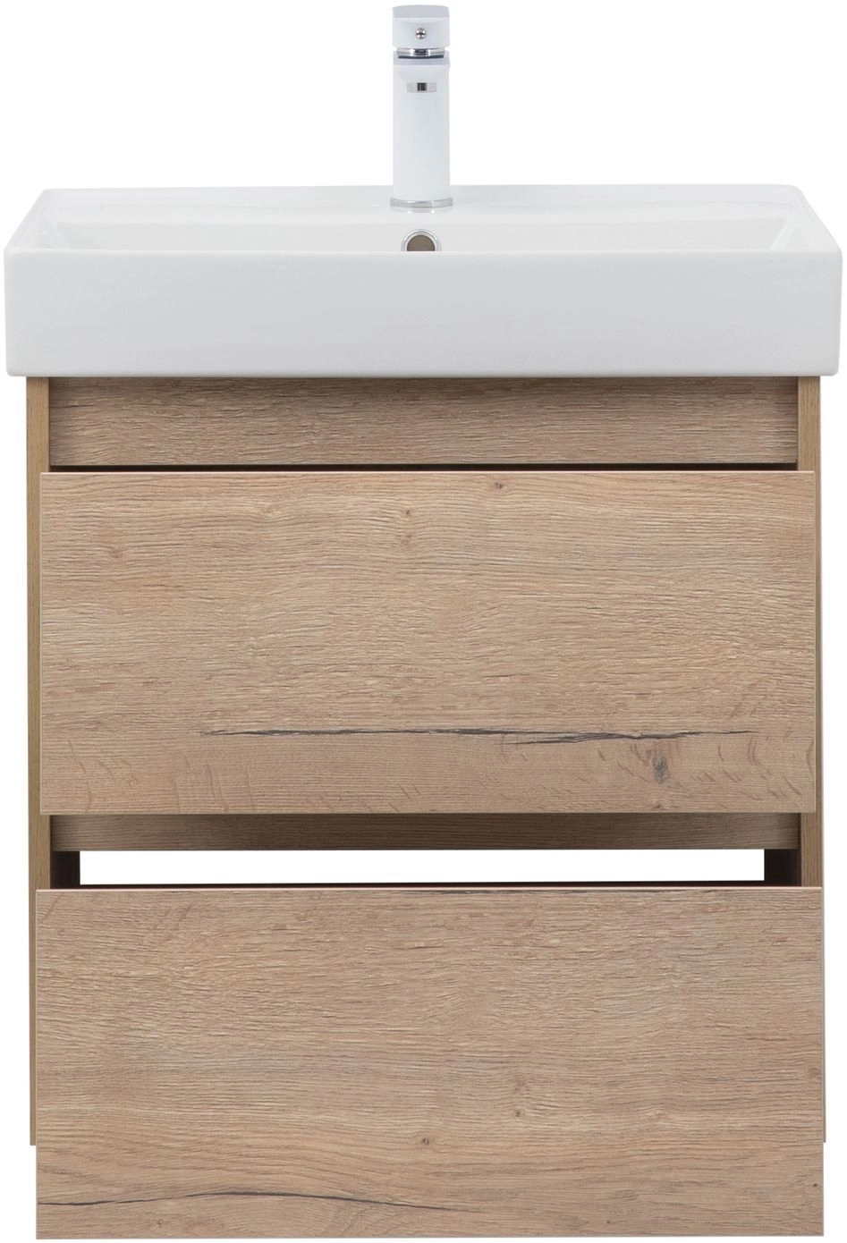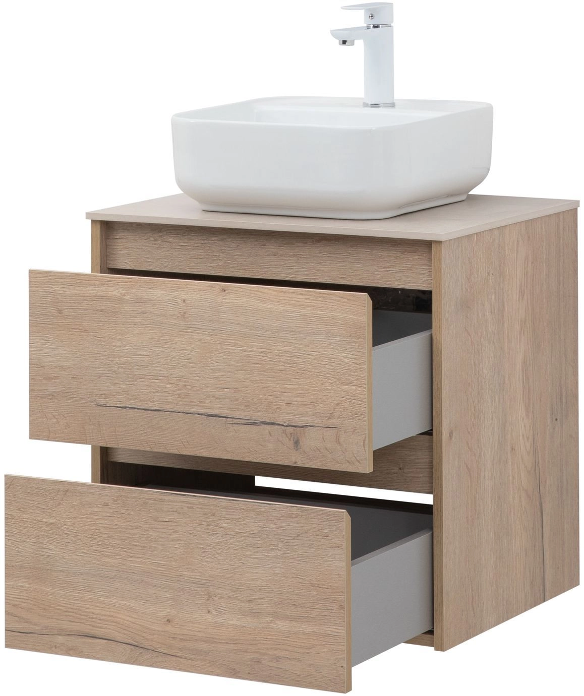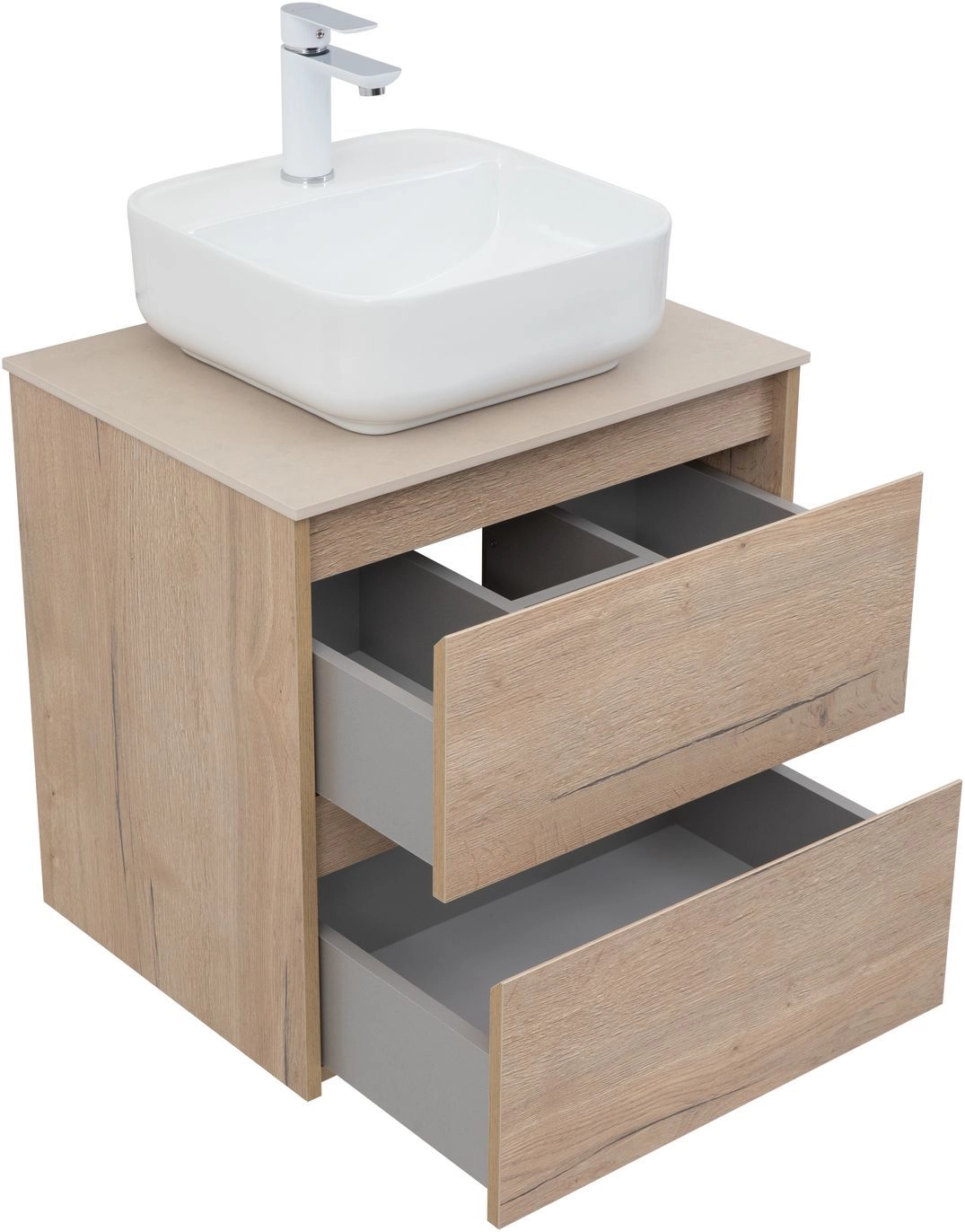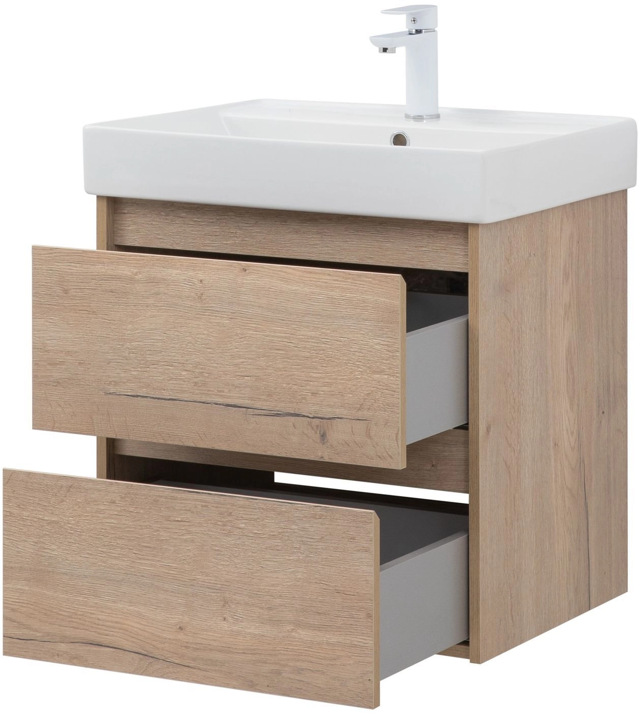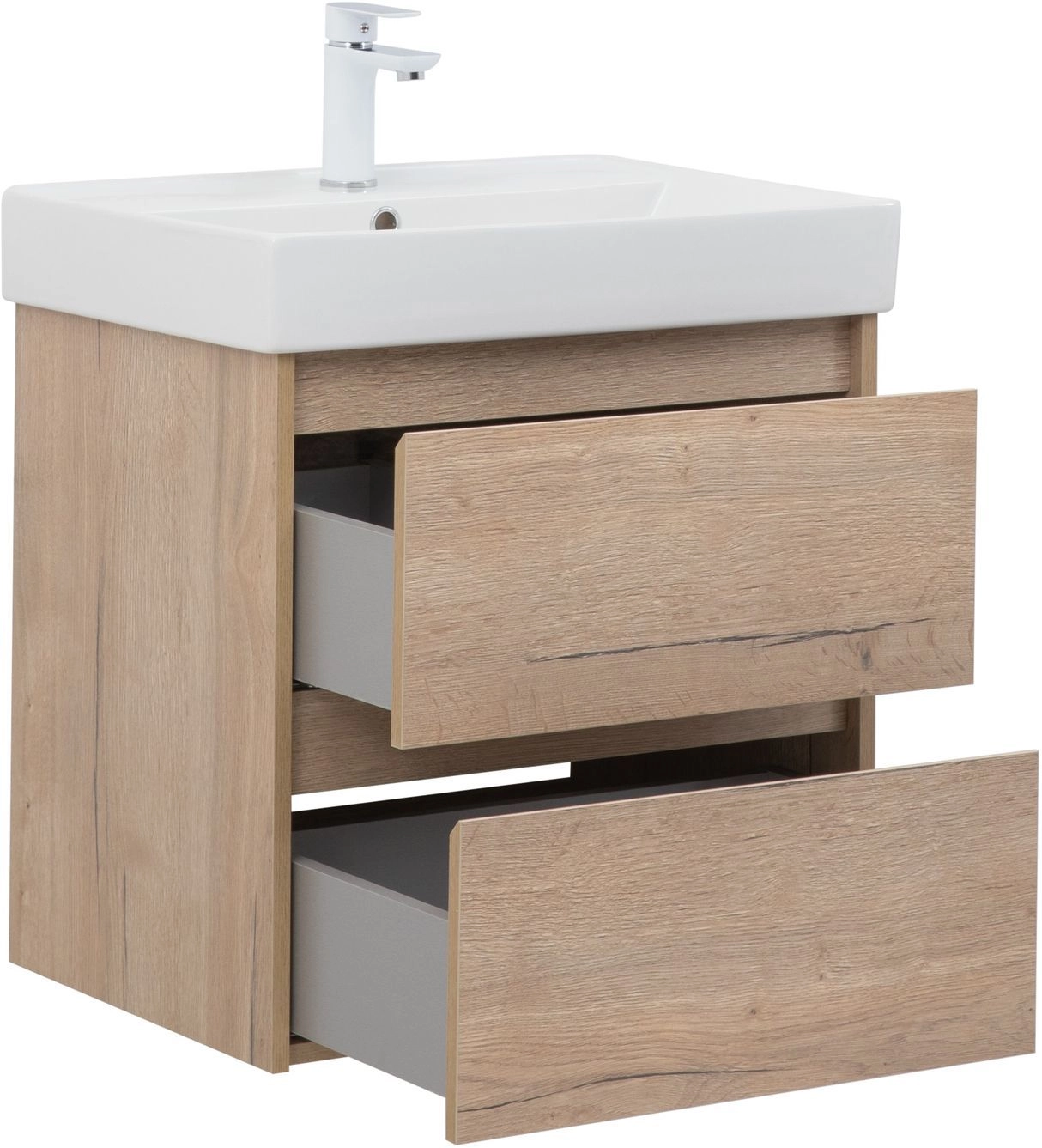 Тумба под раковину Aquanet Nova Lite 60 из влагостойкой ламинированной древесно-стружечной плиты в изысканном цвете «дуб крафт» имеет достойный вид. Фактура натурального дерева выглядит благородно, а подвесной монтаж придает визуальную легкость тумбе шириной 60 см. Она оборудована двумя выдвижными ящиками. Ящики довольно вместительные и позволяют разместить все необходимое. Фасады выполнены с декоративной интегрированной ручкой, не имеющей острых краев и внутренних углов, что обеспечивает удобство в эксплуатации и легкий уход за мебелью. Ящики комплектуются направляющими немецкого производства Hettich Quadro, оснащенными доводчиками. Для комплектации тумбы можно выбрать: либо неглубокую стильную встраиваемую керамическую раковину «Латина», либо столешницу, в которой уже предусмотрено отверстие для установки накладной раковины.