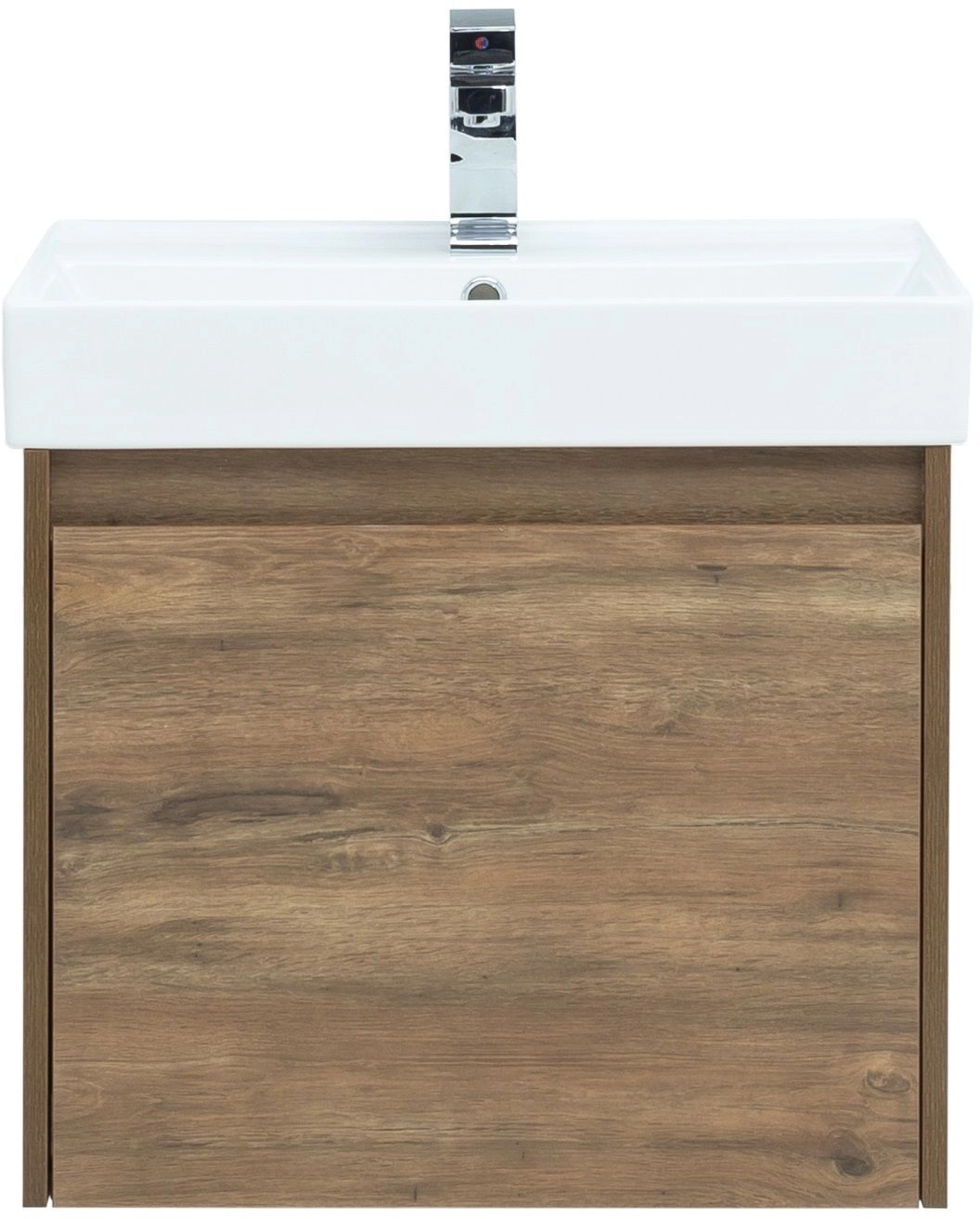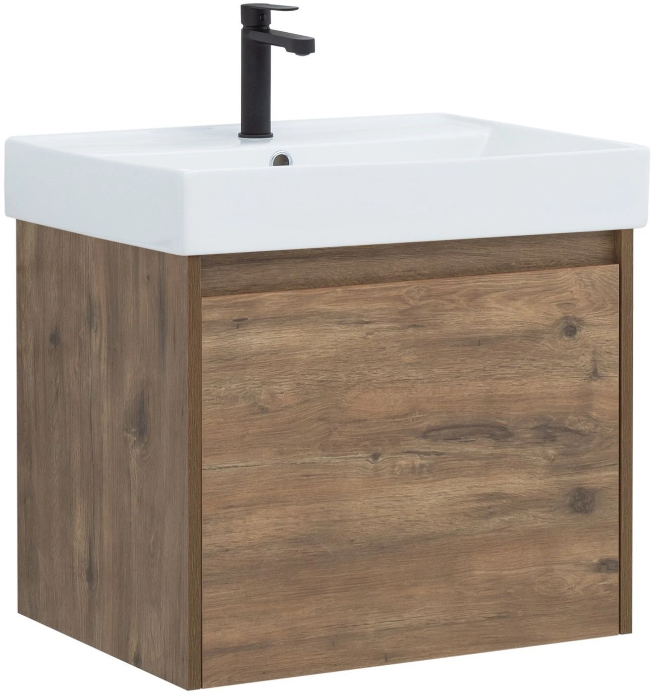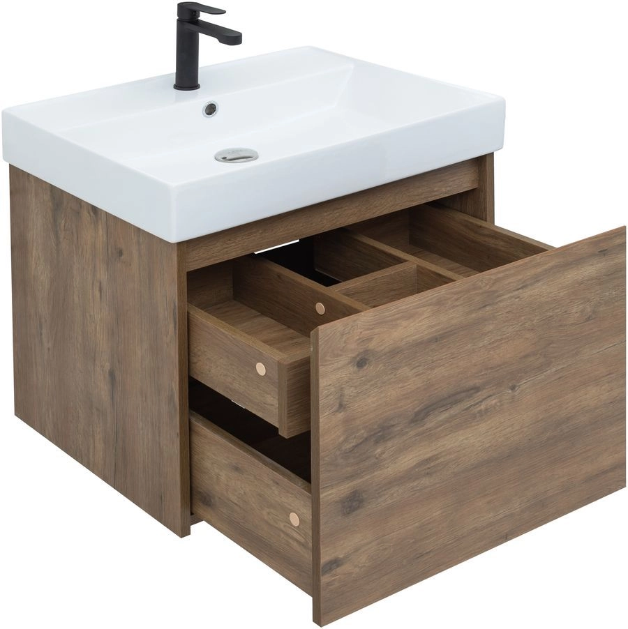 Тумба под раковину Aquanet Nova Lite 60 из влагостойкой ламинированной древесно-стружечной плиты в изысканном цвете «дуб рустикальный» имеет достойный вид. Фактура натурального дерева выглядит благородно, а подвесной монтаж придает визуальную легкость тумбе шириной 60 см. Она оборудована одним ящиком, при открывании которого обнаруживается еще один небольшой для мелочей. Фасад выполнен с декоративной интегрированной ручкой, не имеющей острых краев и внутренних углов, что обеспечивает удобство в эксплуатации и легкий уход за мебелью. Ящики комплектуются направляющими немецкого производства Hettich Quadro, оснащенными доводчиками. Неглубокая и стильная керамическая раковина «Латина» идеально подходит к тумбе.