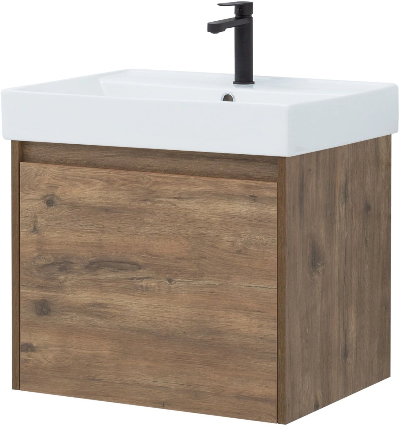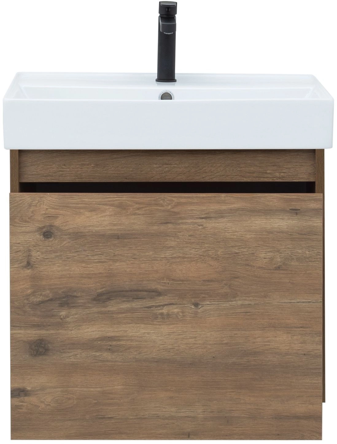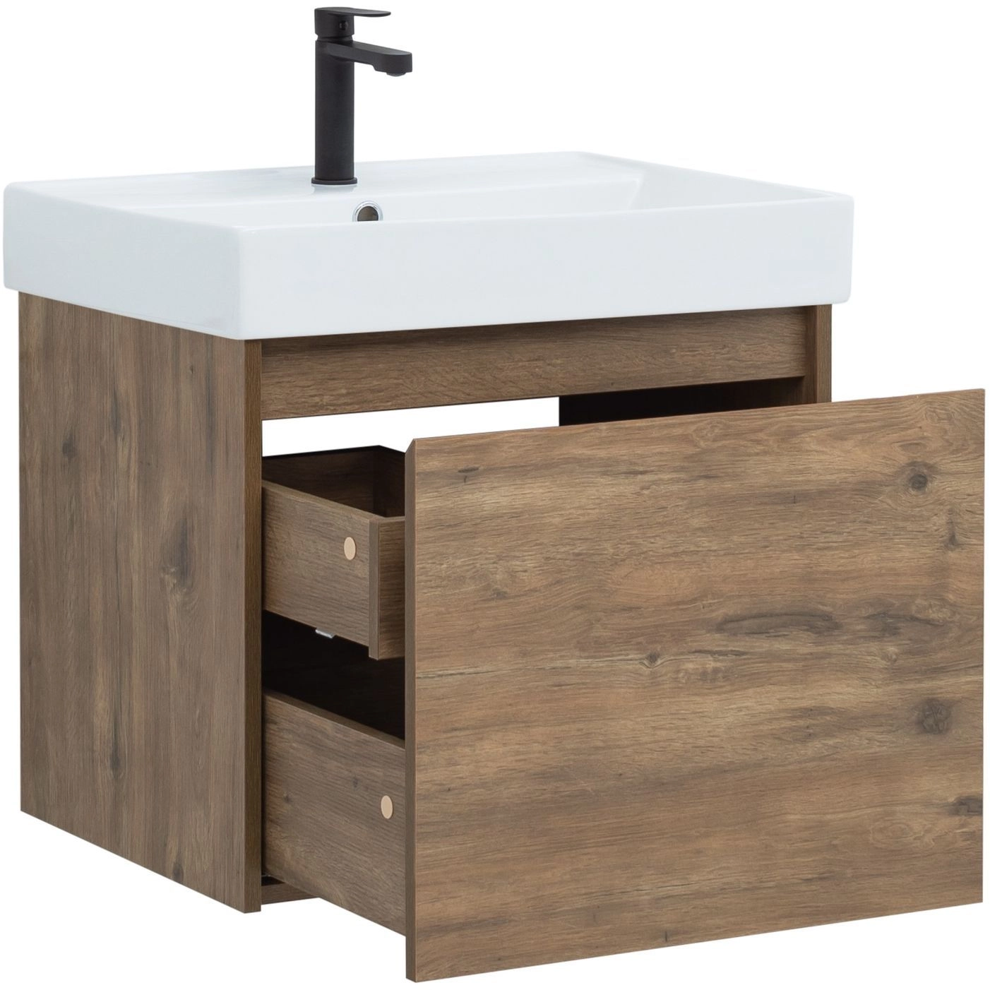 Тумба под раковину Aquanet Nova Lite 60 из влагостойкой ламинированной древесно-стружечной плиты в изысканном цвете «дуб рустикальный» имеет достойный вид. Фактура натурального дерева выглядит благородно, а подвесной монтаж придает визуальную легкость тумбе шириной 60 см. Она оборудована одним ящиком, при открывании которого обнаруживается еще один небольшой для мелочей. Фасад выполнен с декоративной интегрированной ручкой, не имеющей острых краев и внутренних углов, что обеспечивает удобство в эксплуатации и легкий уход за мебелью. Ящики комплектуются направляющими немецкого производства Hettich Quadro, оснащенными доводчиками. Неглубокая и стильная керамическая раковина «Латина» идеально подходит к тумбе.