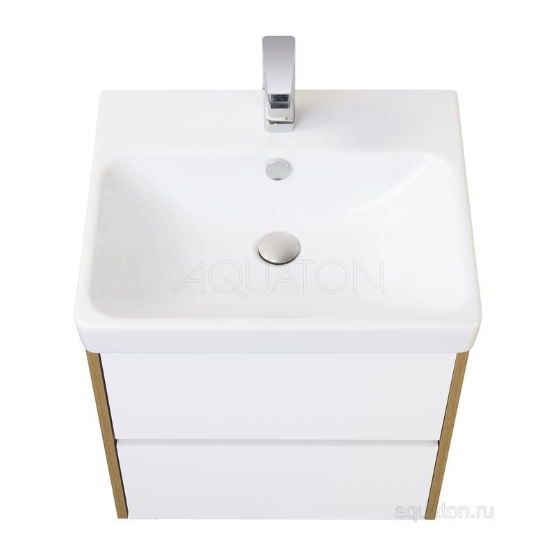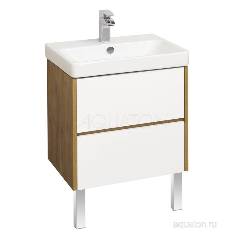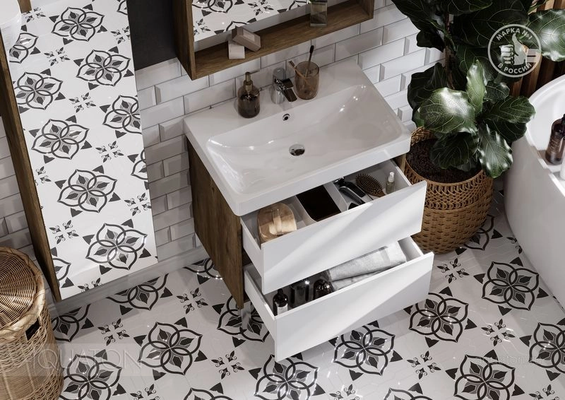 Тумба Сканди 70 выполнена в популярном минималистичном скандинавском стиле. Корпус тумбы выполнен из влагостойкой ЛДСП в декоре натурального дерева, а фасады в белой глянцевой покраске. Конструктивно тумба состоит из 2 вместительных ящиков, установленных на направляющие с интегрированной системой push-to-open для комфортного использования. На тумбе нет выступающих деталей и фурнитуры, открытие ящиков реализовано нажатием на фасад. Тумба комплектуется белоснежной раковиной Адриана от бренда Santek. Тумбу по желанию можно использовать в двух вариантах: как подвесную или дополнительно приобрести опоры
