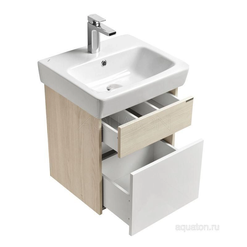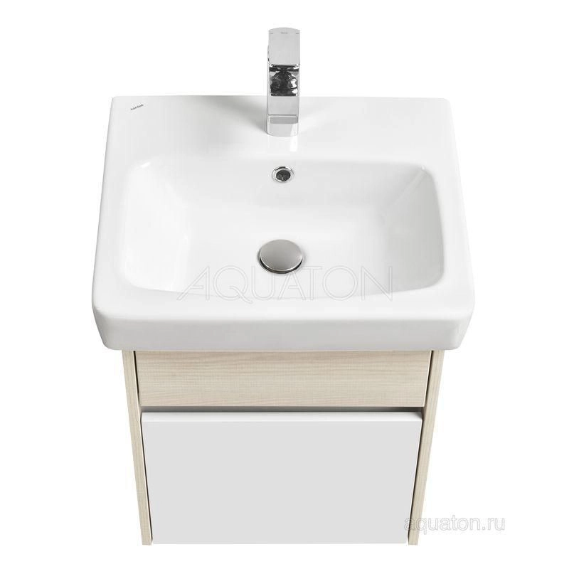 Подвесная тумба под раковину Верди PRO 50 от AQUATON - функциональное и практичное решение для ванных комнат и санузлов со скромными габаритами. Компактная модель с комбинированной отделкой не занимает много места и позволяет разместить всё необходимое. Минималистичный дизайн подчеркивает отсутствие лицевой фурнитуры. Верхний фасад и корпус тумбы изготовлены из ламинированной, текстурированной влагостойкой ЛДСП в цвете ясень фабрик. Нижний фасад выполнен из МДФ и окрашен в белый цвет высокой степени глянца. Конструкция верхнего ящика подвесных тумб разделена на две секции, что очень удобно для хранения мелких предметов. Глубокий и вместительный нижний ящик предназначен для более габаритных предметов.