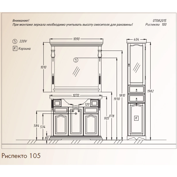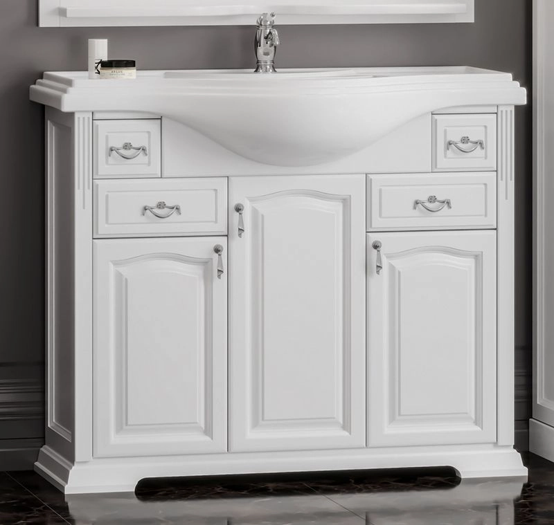 Коллекция Риспекто символизирует лучшие традиции неоклассики в сочетании с необыкновенной функциональностью и простотой дизайна. Успех и уникальность коллекции Риспекто формируется из нескольких вариантов отделок Нагал, Слоновая кость и Белая, а также размерным рядом моделей 95 см, 105 см и 120 см и глубокой керамической раковиной. Завершенность стилю коллекции Риспекто придают сложные филенчатые фасады мебели. Несколько вариантов пеналов (узкий, стандартный (с бельевой корзиной) и двустворчатый) удачно завершают комплектацию коллекции Риспекто. Размеры 1070/905/510 ш/в/г. Вся мебель Opadiris покрыта прочным слоем влагостойкого лака. Материалы изготовления : Массив дерева — Бук. Корпус : Корпус мебели изготавливается из ламинированных панелей ДСП высшего сорта категории качества Е1 а в некоторых изделиях из ценных пород массива дерева (БУК). Обладает повышенной влагостойкостью и сопротивляемостью износам и ударам. Не выделяет вредных испарений в воздух, хорошо выдерживает воздействие бытовых химических средств. Края корпусных деталей так же защищены ПВХ кромкой. Отделка : Защитный слой фасадов и корпусных деталей состоит из нескольких слоев грунта и матовой отделочной эмали производства Herberiz (Германия) и Renner(Италия). Фурнитура : Надежная фурнитура BRASS (Испания Италия), BOYARD и HETTICH (Германия).